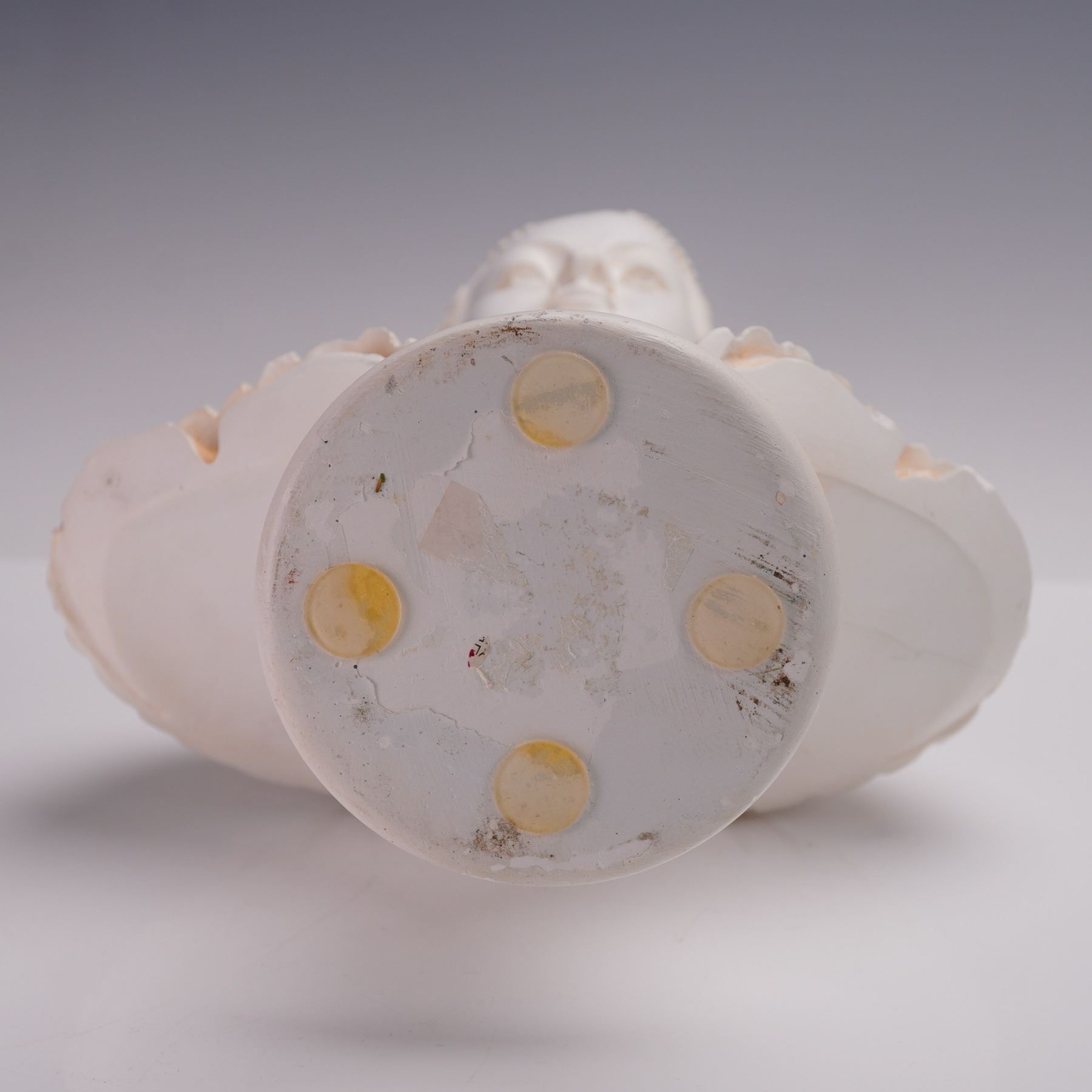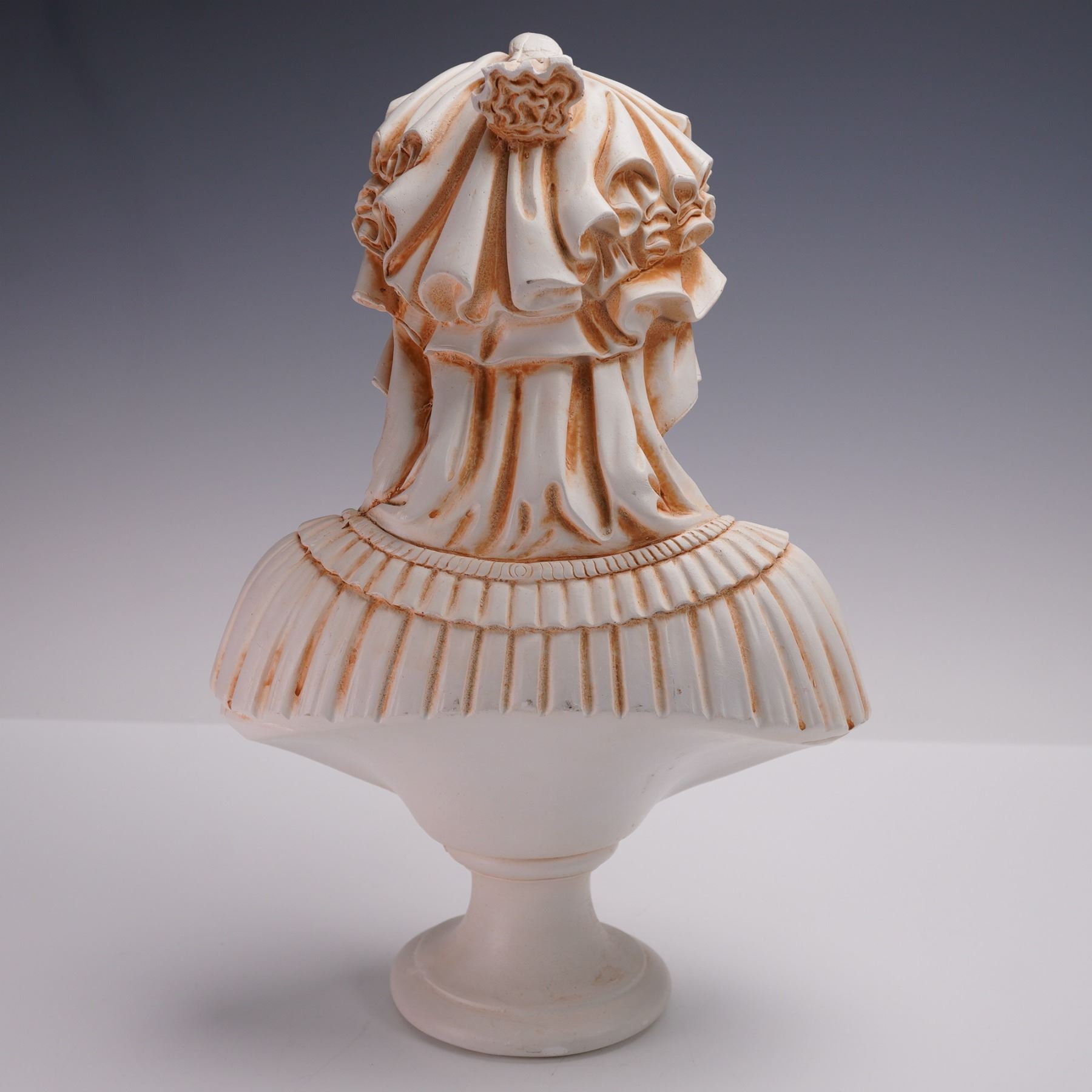 Plaster bust depicting the classical veiled maiden, with finely modeled features and draped garments rendered in high relief. The figure's head is adorned with a detailed headpiece and strand of beads, with the veil cascading over her shoulders. Finished in a soft white tone with subtle terracotta-colored accents to emphasize the sculptural depth. The reverse is fully detailed, and the bust is mounted on a circular pedestal base. The veiled maiden motif, popularized in 19th century European sculpture, was celebrated for its technical mastery in rendering translucent drapery over the human form. Such pieces were often inspired by classical antiquity and Renaissance interpretations of purity, beauty, and mystery.