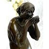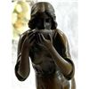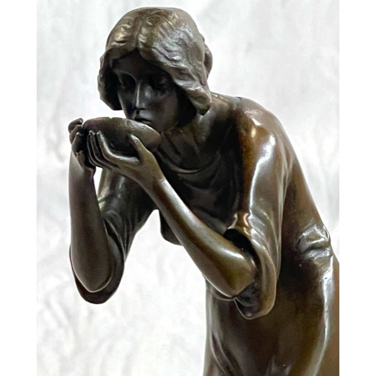 Classical style woman drinking from a bowl sculpture. Lost wax casting method bronze, with brown patina, mounted on a marble base. 10" H X 4 1/2" W.Â
