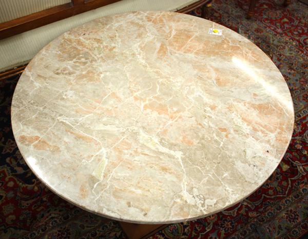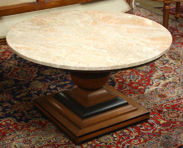 Marble top low table, the circular top rising on a pedestal base terminating on a partial ebonized plinth, 17.5''h x 31''d
