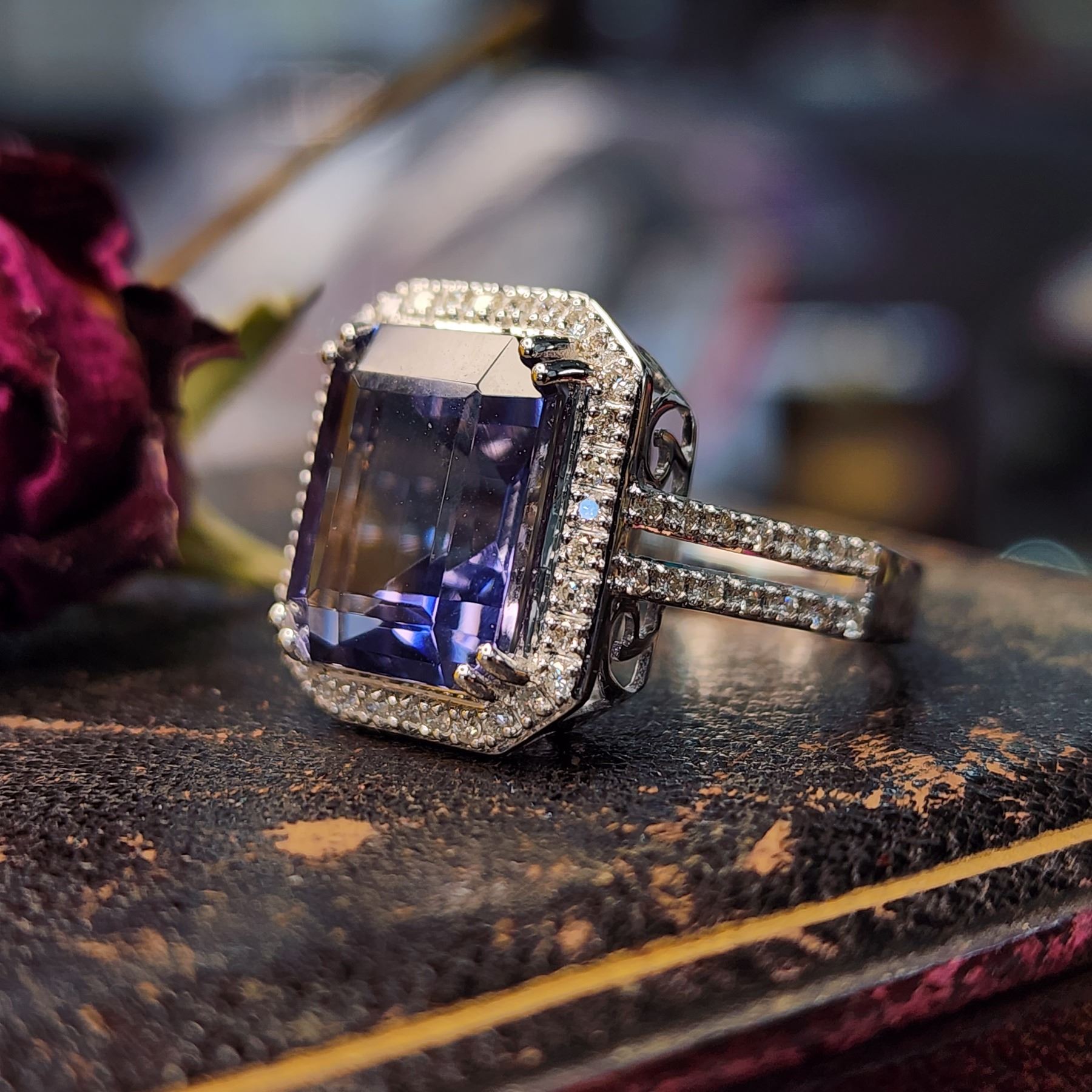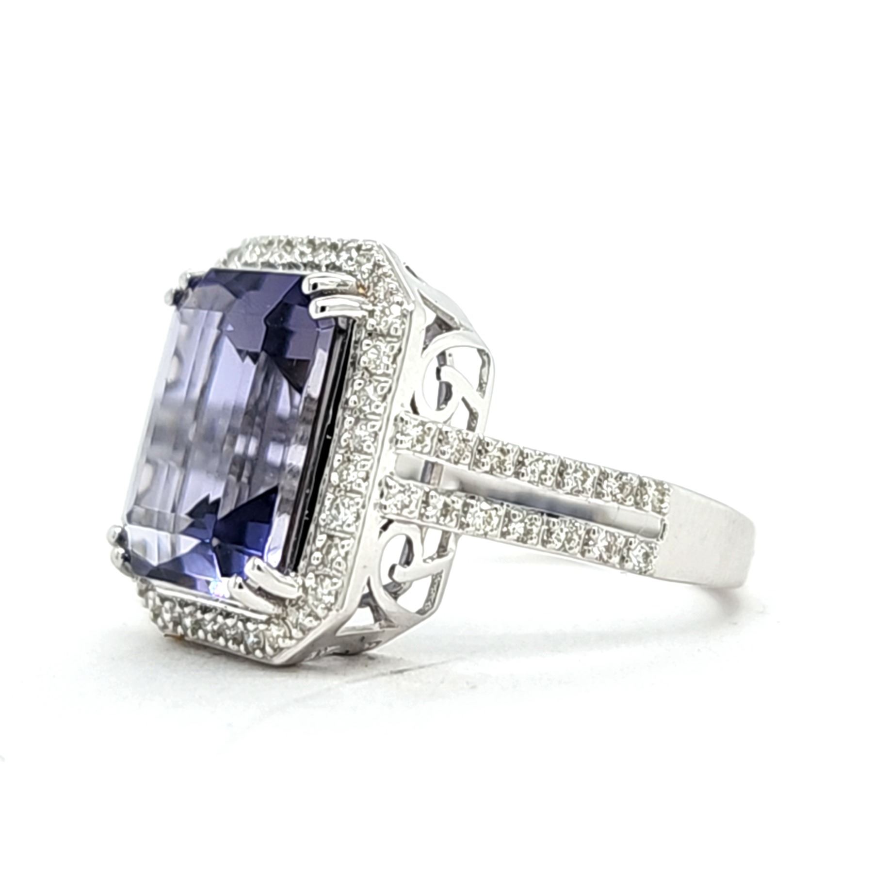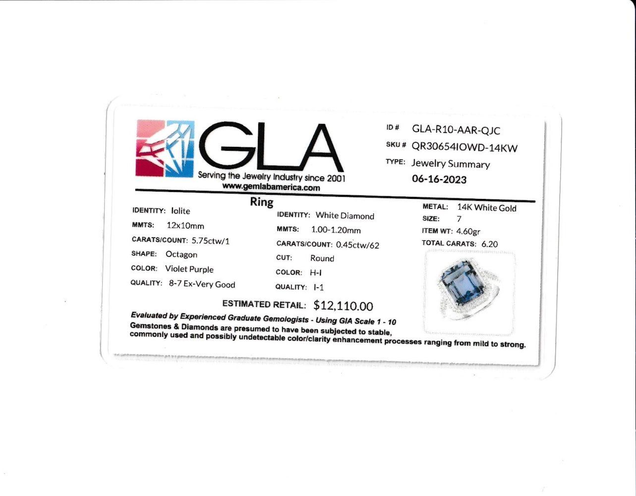 Genuine Iolite and Earth-Mined Diamond Ring. This 14 karat white gold ring features a 5.75 carat octagonal-cut iolite that is double-prong set with .45 carats of round, brilliant-cut, H-I color, I1 clarity diamonds in the halo and the double lined shoulders.& nbsp; The ring is US size 7 and has supportive galleries.& nbsp; This ring can be resized for an additional $100, please allow an additional 10 days for shipping if we resize it. This ring is certified and appraised for $12,110.00 estimated retail replacement value.