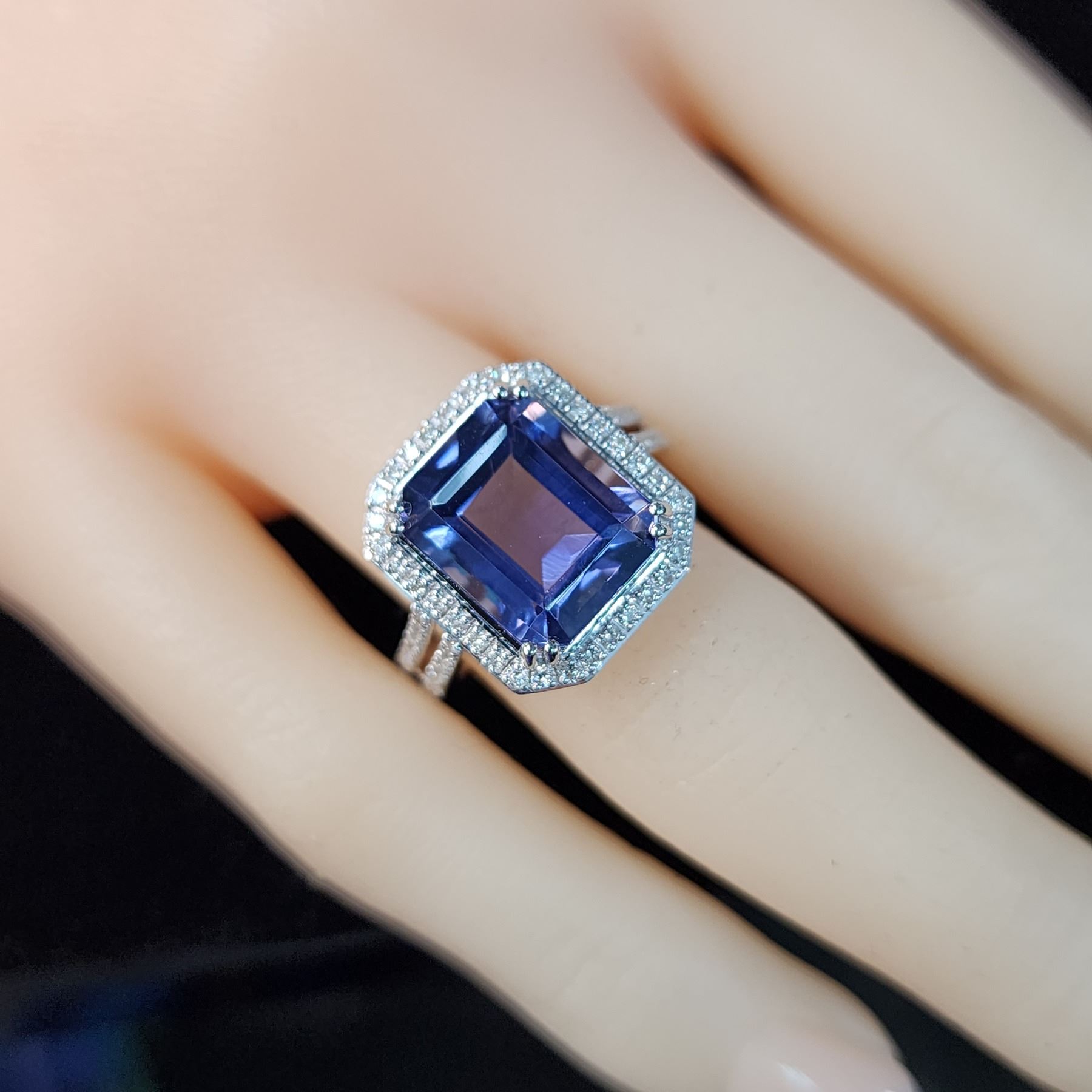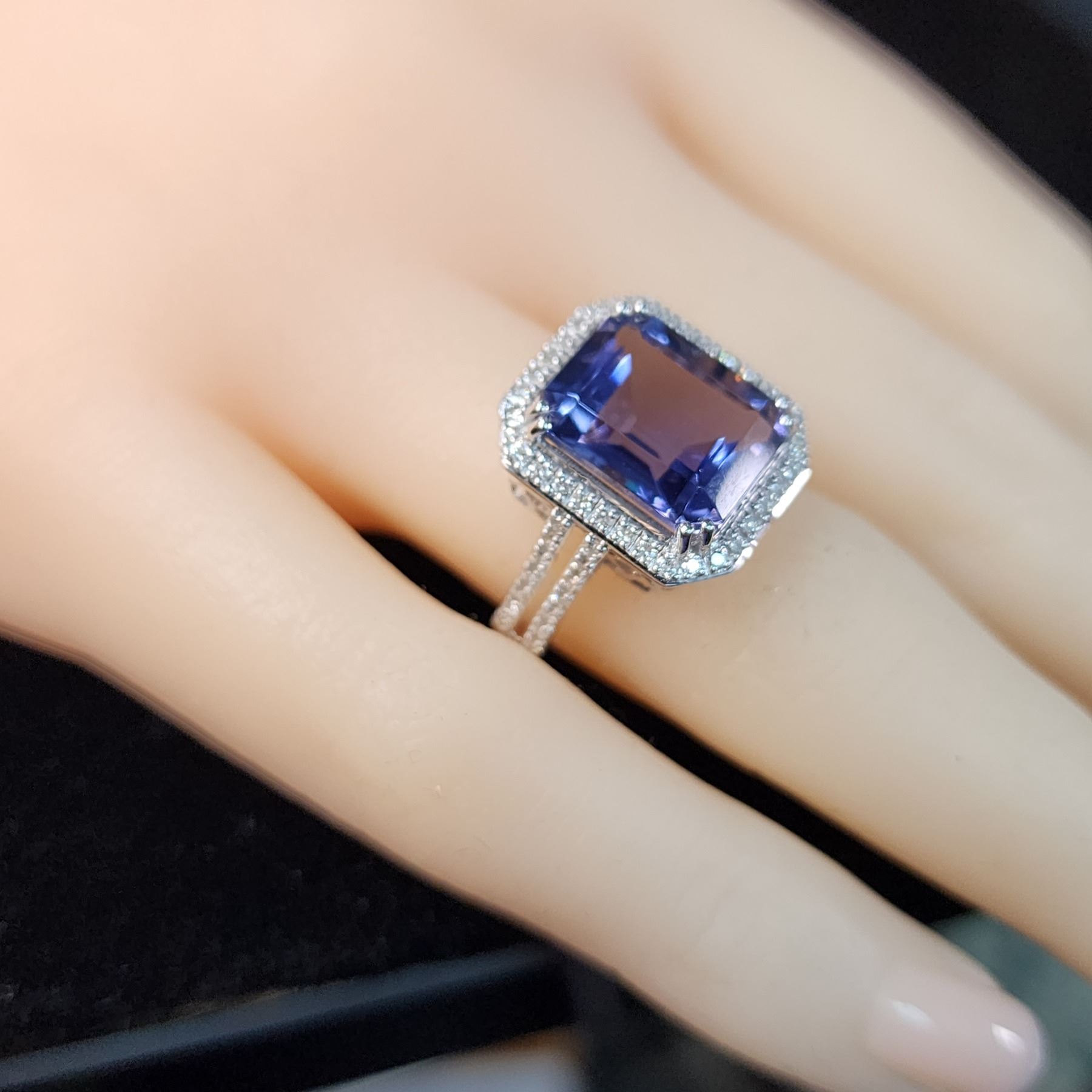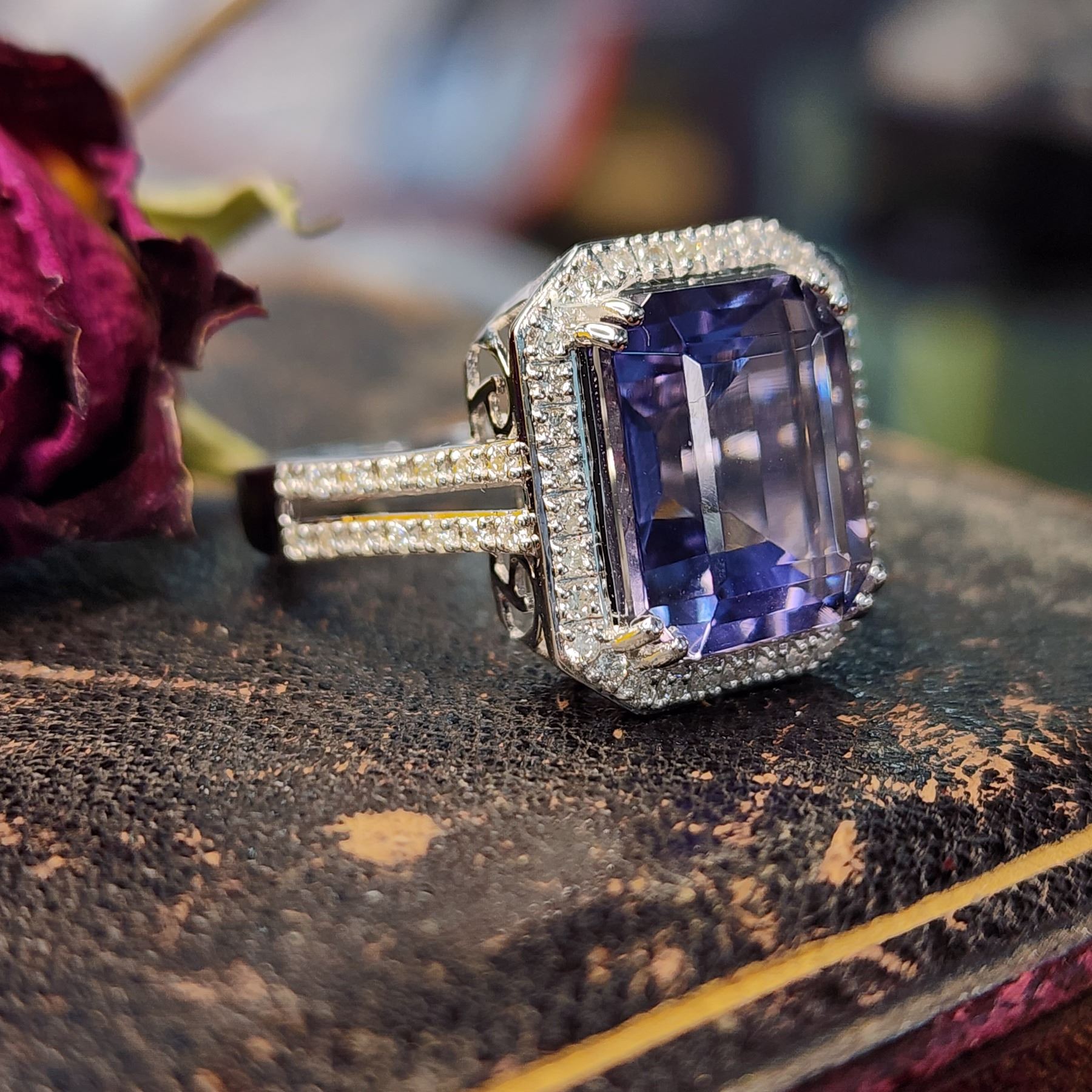 Genuine Iolite and Earth-Mined Diamond Ring. This 14 karat white gold ring features a 5.75 carat octagonal-cut iolite that is double-prong set with .45 carats of round, brilliant-cut, H-I color, I1 clarity diamonds in the halo and the double lined shoulders.& nbsp; The ring is US size 7 and has supportive galleries.& nbsp; This ring can be resized for an additional $100, please allow an additional 10 days for shipping if we resize it. This ring is certified and appraised for $12,110.00 estimated retail replacement value.