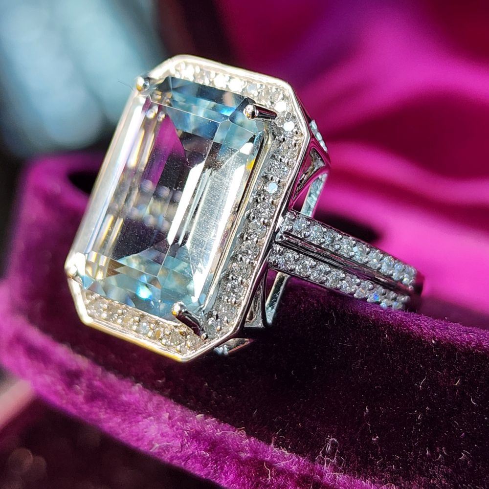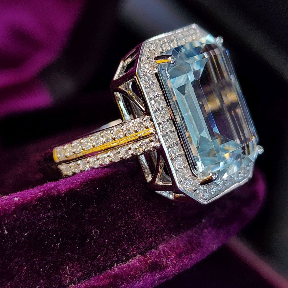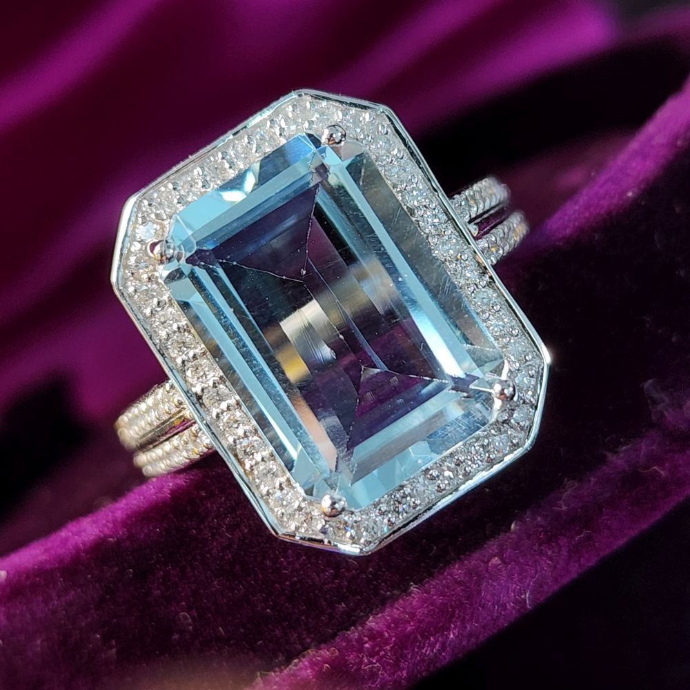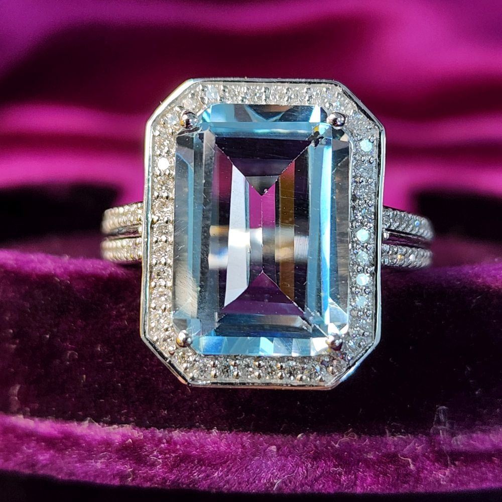 Genuine Aquamarine and Earth-Mined Diamond Ring.& nbsp; Aquamarines have long been considered a & quot;must-have& quot; gemstone for jewelry among the affluent society ladies.& nbsp; The cool blue color may seem subtle, but its beauty makes a strong impression.& nbsp; This 14 karat white gold ring features a 5.37 carat elongated octagonal-cut aquamarine that has a smooth, even color.& nbsp; There is .48 carats of micro-pave' set round, brilliant-cut, H-I color, I1 clarity diamonds in the fitting halo and raised shoulders. The aquamarine is supported with a reinforced under gallery, and trussed and swirled side galleries. The ring is approximately 1/2& quot; x 3/4& quot; on the finger. The ring is US size 7 and has an approximate 2.5 mm shank.& nbsp; This ring can be resized for an additional $100, please allow an additional 10 days for shipping if we resize it.& nbsp; This ring is certified and appraised for $13,450.00 estimated retail replacement value.& nbsp; DON'T MISS THE MATCHING PENDANT IN LOT 76!!!
