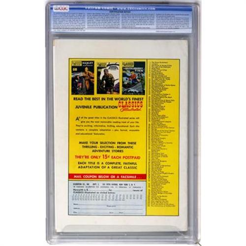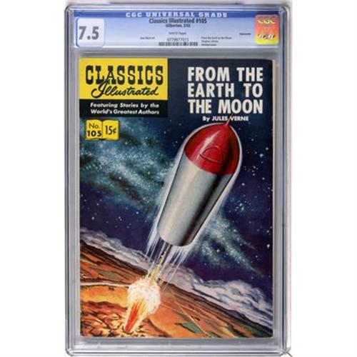 <B>Classics Illustrated #105 From Earth to the Moon First Edition - Vancouver pedigree (Gilberton, 1953) CGC VF- 7.5 White pages.</B></I> From Earth to the Moon. Alex Blum art. First edition. Highest grade yet assigned by CGC for this issue. Overstreet 2007 VF 8.0 value = $44. CGC census 6/07: 1 in 7.5, none higher.<BR><BR><b>Shipping:</b> Comics - Slabbed (certified) (<a target="_blank" href="http://www.heritageauctions.com/common/shipping.php">view shipping information</a>)