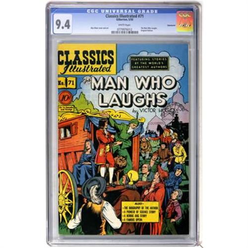 <B>Classics Illustrated #71 The Man Who Laughs First Edition - Vancouver pedigree (Gilberton, 1950) CGC NM 9.4 White pages.</B></I> The Man Who Laughs. First edition. Alex Blum cover and art. Highest grade yet assigned by CGC for this issue. Overstreet 2007 NM- 9.2 value = $185. CGC census 6/07: 1 in 9.4, none higher.<BR><BR><b>Shipping:</b> Comics - Slabbed (certified) (<a target="_blank" href="http://www.heritageauctions.com/common/shipping.php">view shipping information</a>)
