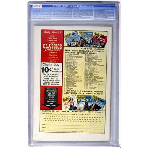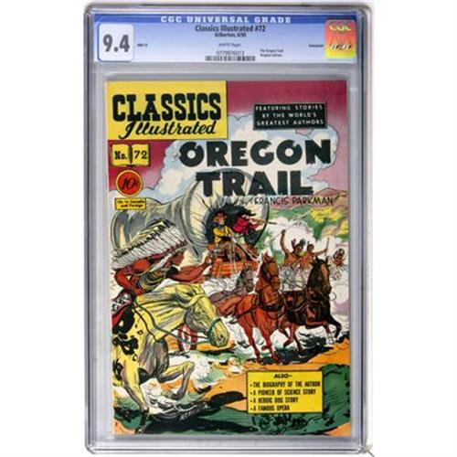 <B>Classics Illustrated #72 The Oregon Trail First Edition - Vancouver pedigree (Gilberton, 1950) CGC NM 9.4 White pages.</B></I> The Oregon Trail. Henry Kiefer cover and art. First edition. Highest grade yet assigned by CGC for this issue. Overstreet 2007 NM- 9.2 value = $105. CGC census 6/07: 1 in 9.4, none higher.<BR><BR><b>Shipping:</b> Comics - Slabbed (certified) (<a target="_blank" href="http://www.heritageauctions.com/common/shipping.php">view shipping information</a>)