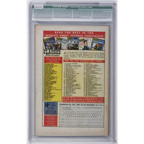 This is the only CGC-certified copy of this issue (Qualified or otherwise), and the green label was assigned for the price sticker, something we've seen on blue-label books in the past. At any rate, this issue's 8/50 date puts it just a few months before the price of the line was raised to 15 cents -- since the higher price is also stamped on the back cover, it's fair to assume this one was ordered as a back issue from the ubiquitous back-cover ad. Note that this is the first and only edition. CGC notes, "Price sticker on cover." Overstreet 2006 VF 8.0 value = $199. <I>From the Crippen Collection.</B></I><BR><BR><b>Shipping:</b> Slabbed Comic (<a target="_blank" href="http://www.heritageauctions.com/common/shipping.php">view shipping information</a>)