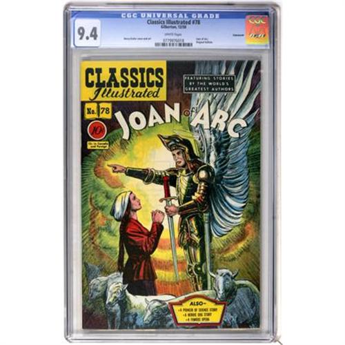 <B>Classics Illustrated #78 Joan of Arc First Edition - Vancouver pedigree (Gilberton, 1950) CGC NM 9.4 White pages.</B></I> Joan of Arc. Henry Kiefer cover and art. First edition. Overstreet 2007 NM- 9.2 value = $105. CGC census 6/07: 1 in 9.4, none higher.<BR><BR><b>Shipping:</b> Comics - Slabbed (certified) (<a target="_blank" href="http://www.heritageauctions.com/common/shipping.php">view shipping information</a>)