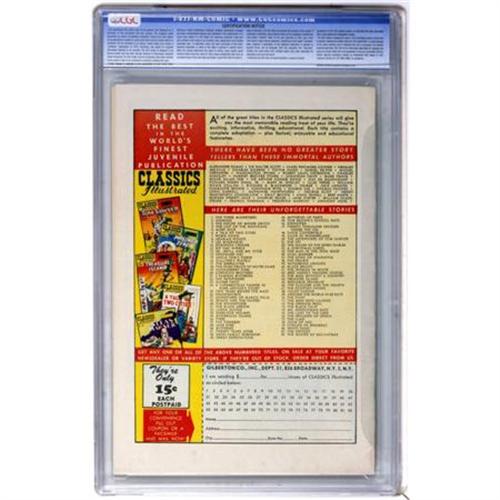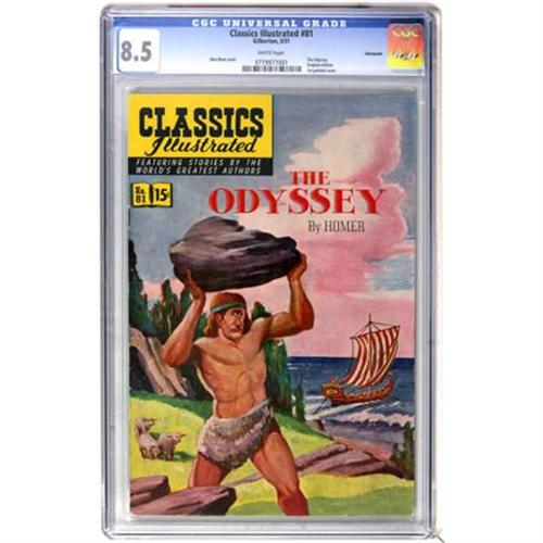 <B>Classics Illustrated #81 The Odyssey First Edition - Vancouver pedigree (Gilberton, 1951) CGC VF+ 8.5 White pages.</B></I> The Odyssey by Homer. First painted cover by Alex Blum. First edition. Highest grade yet assigned by CGC for this issue. Overstreet 2007 VF 8.0 value = $60; VF/NM 9.0 value = $83. CGC census 6/07: 1 in 8.5, none higher.<BR><BR><b>Shipping:</b> Comics - Slabbed (certified) (<a target="_blank" href="http://www.heritageauctions.com/common/shipping.php">view shipping information</a>)