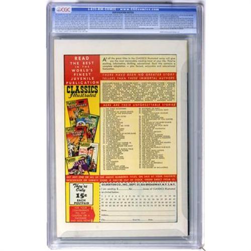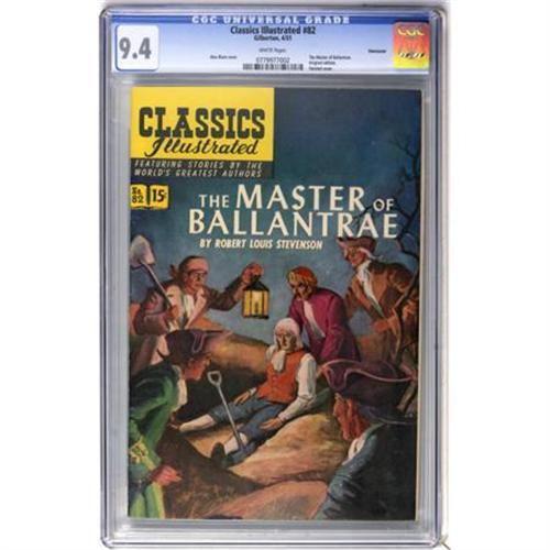 <B>Classics Illustrated #82 The Master of Ballantrae First Edition - Vancouver pedigree (Gilberton, 1951) CGC NM 9.4 White pages.</B></I> The Master of Ballantrae. Painted cover by Alex Blum. First edition. The highest graded of just two CGC-certified copies of this issue to date. Overstreet 2007 NM- 9.2 value = $85. CGC census 6/07: 1 in 9.4, none higher.<BR><BR><b>Shipping:</b> Comics - Slabbed (certified) (<a target="_blank" href="http://www.heritageauctions.com/common/shipping.php">view shipping information</a>)
