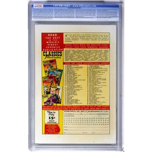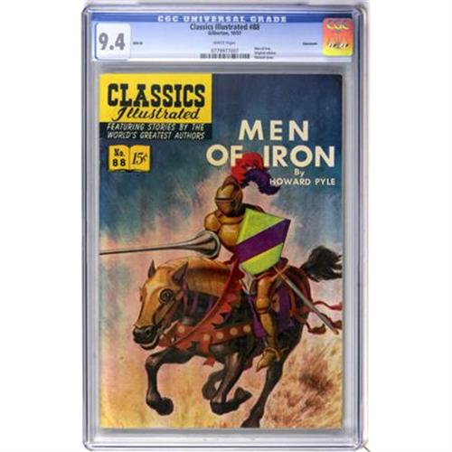 <B>Classics Illustrated #88 Men of Iron First Edition - Vancouver pedigree (Gilberton, 1951) CGC NM 9.4 White pages.</B></I> Men of Iron. Painted cover. First edition. Highest grade yet assigned by CGC for this issue. Overstreet 2007 NM- 9.2 value = $75. CGC census 6/07: 1 in 9.4, none higher.<BR><BR><b>Shipping:</b> Comics - Slabbed (certified) (<a target="_blank" href="http://www.heritageauctions.com/common/shipping.php">view shipping information</a>)
