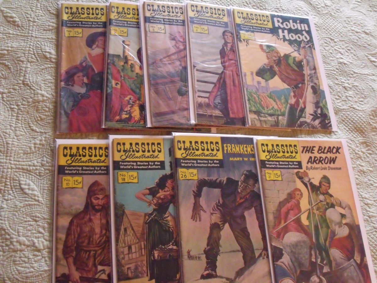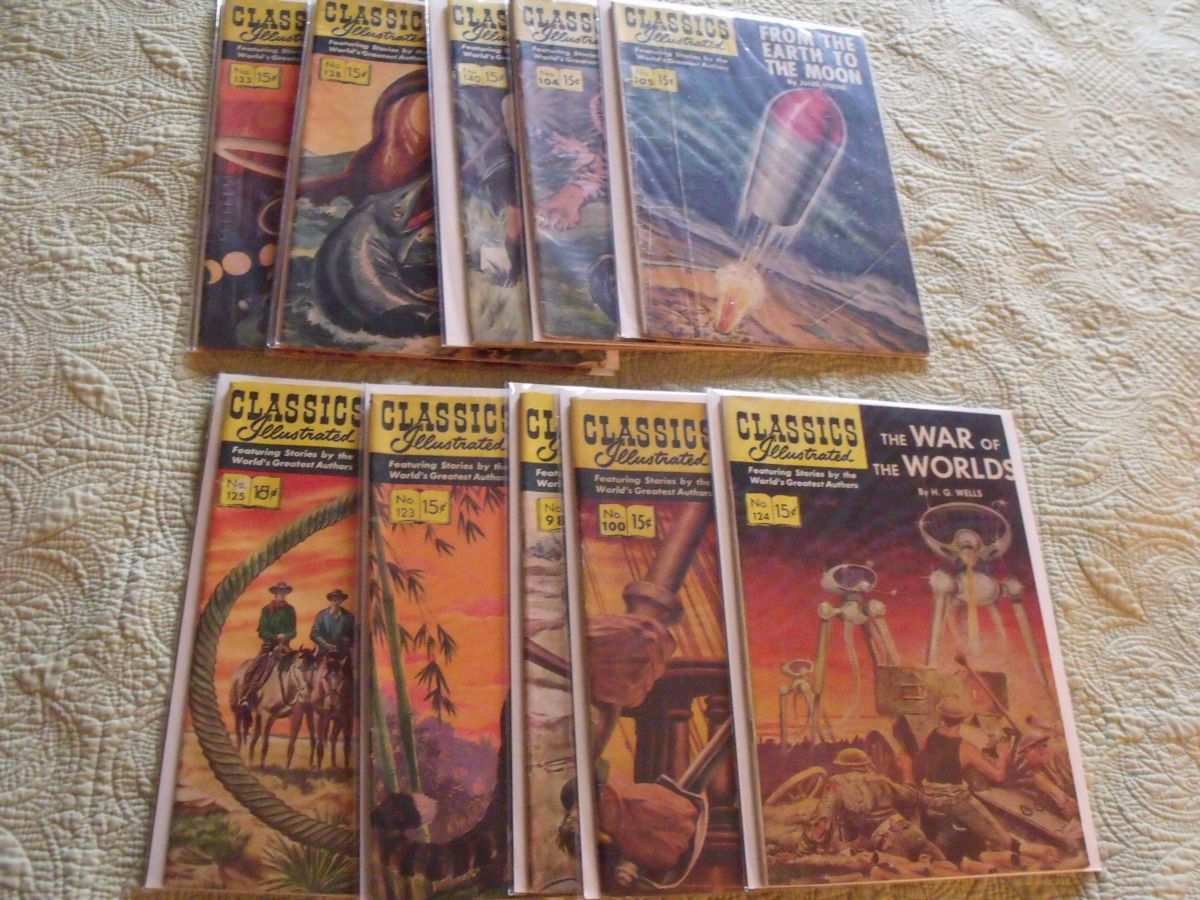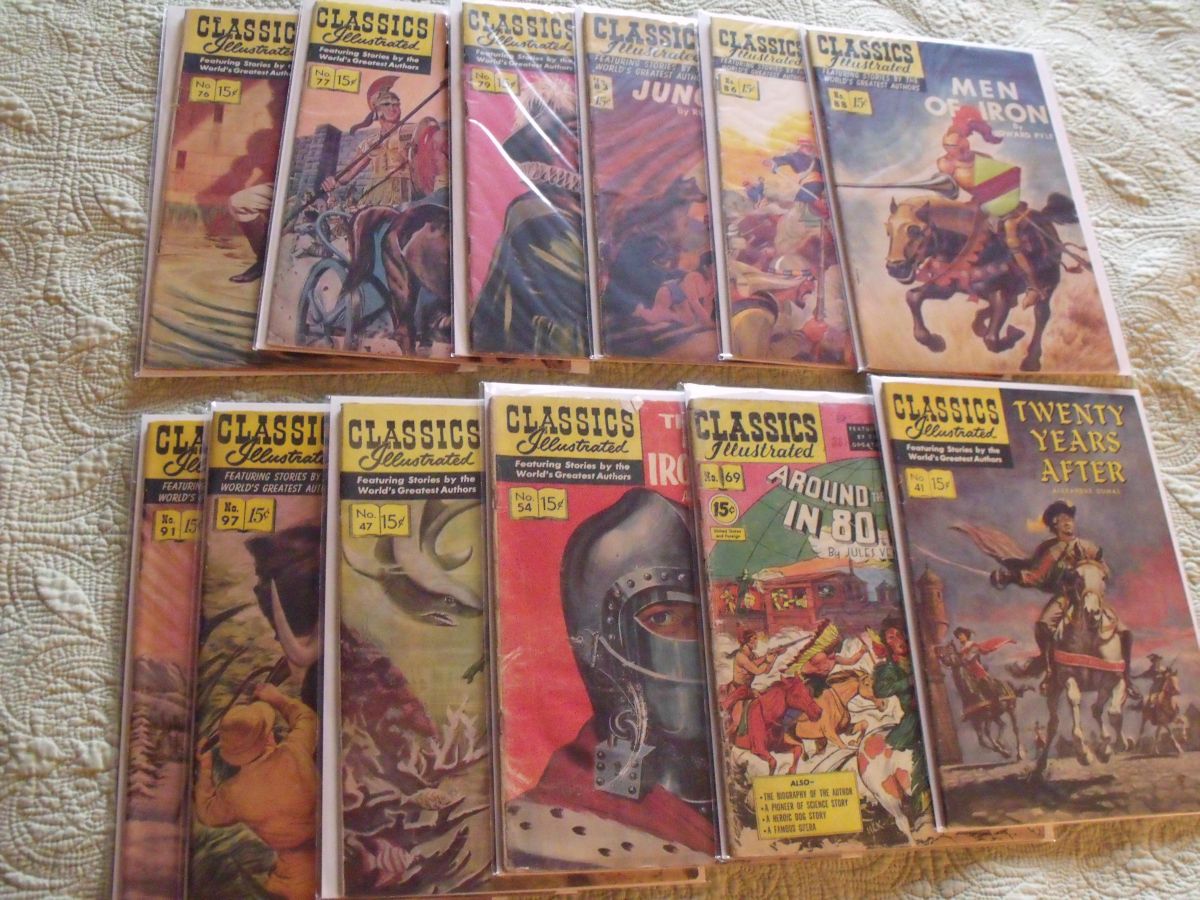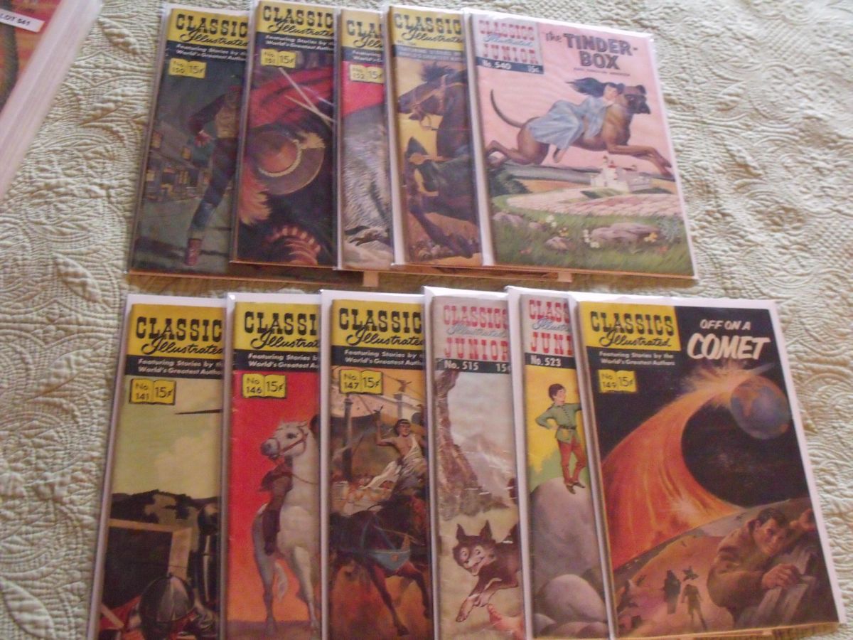 Classics Illustrated #1-2, 5-7, 10, 18, 26, 31, 41, 47, 54, 69, 76-77, 79, 83, 86, 88, 91, 97-98, 100, 104-105, 123-125, 133, 137-138, 140-141, 146-147, 149-152, 164, Classics Illustrated Junior #515, 523, 540. 43 issues total, avg condition ranges from VG to FN+