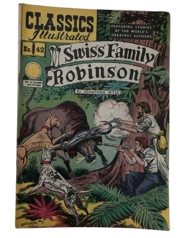 #42 – Swiss Family Robinson by Johann Wyss Condition: Fair to Good A beloved survival adventure, this issue captures the spirit of ingenuity and family resilience on a deserted island.