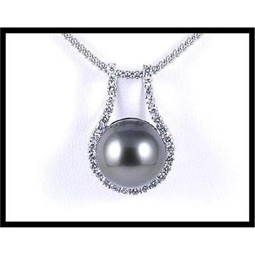 Classy pendant with 1 black pearl (11.9 millimeters) and 29 full cut diamonds that weigh approximately 0.60 carats set in 14K white gold. The pendant measures 23 millimeters (0.91 inches) x 15 millimeters (0.59 inches) and weighs 3.70 grams total weight and comes with a 14K white gold box chain that measures 18 inches long.