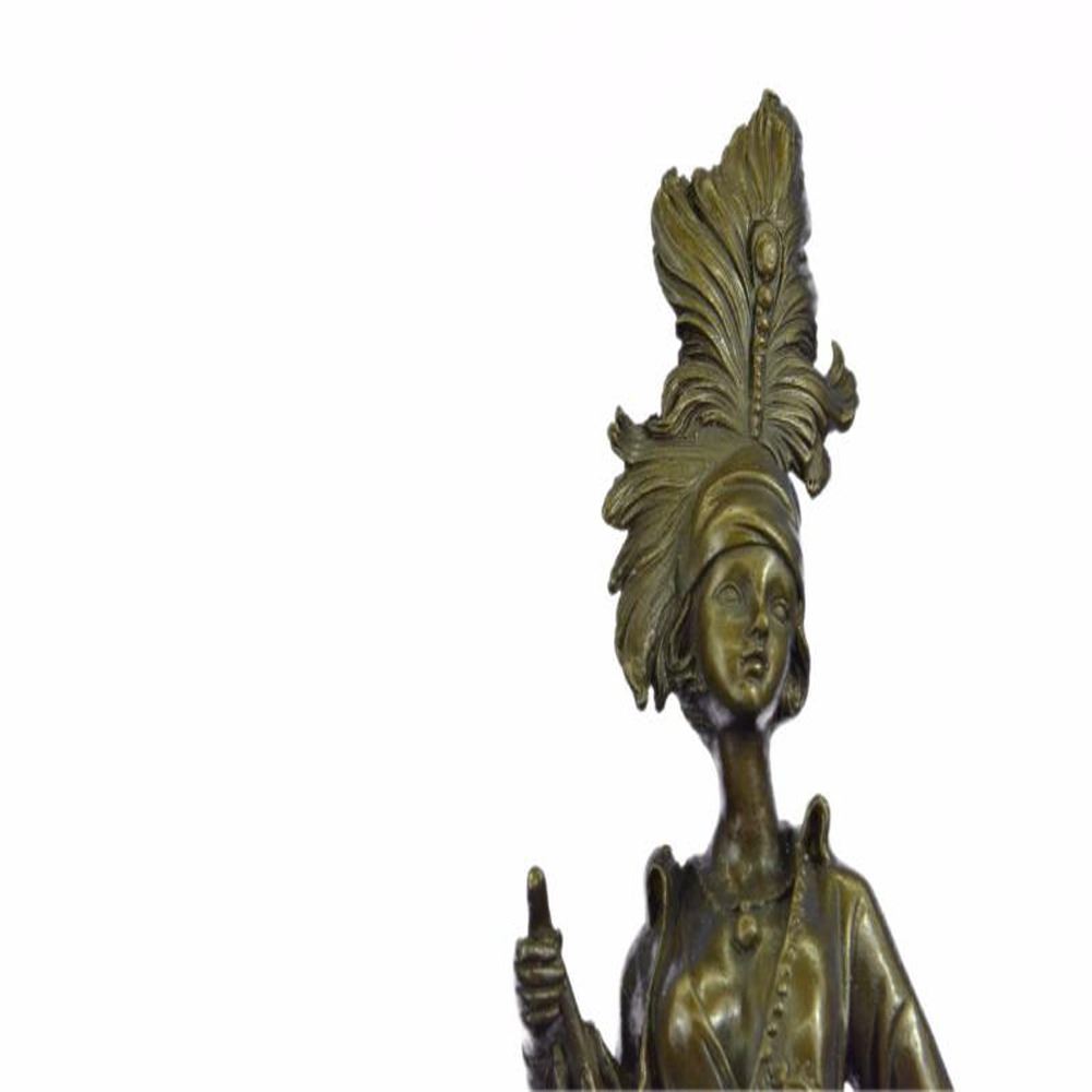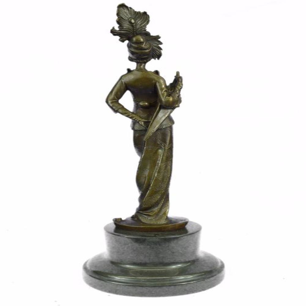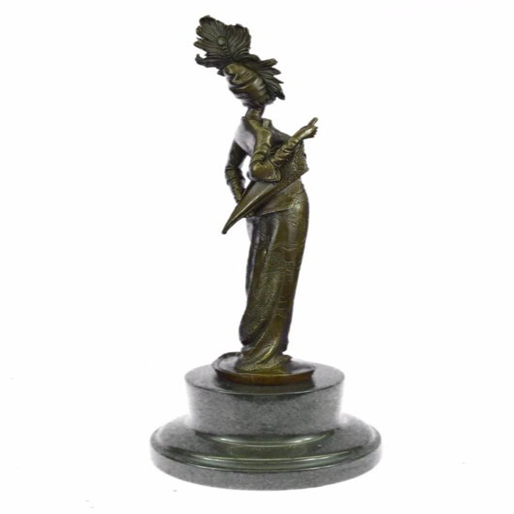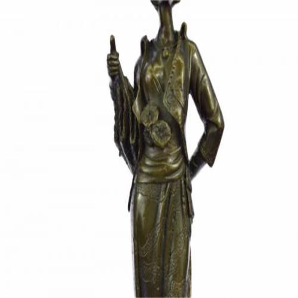 This Sculpture of a 1920s woman is a beautiful piece for an exquisite living room or a young ladys bedroom. As she stands elegantly for her photoshoot, who can forget to mention her unforgettable dress that drops all the way to the floor, while she holds an umbrella under her right arm. The details on her neckless,waist belt, over coat, and her Charleston hat, are unbelievably carved leaving her picture perfected. This is a beautiful Bronze Sculpture cast using the Lost Wax Method and has a gorgeous brown patina and it is mounted on a marble base. Bronze Dimensions with Marble Base: Height 18 X Width 6 inches. Weight: 11 LBS.
