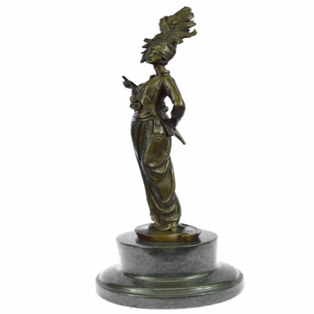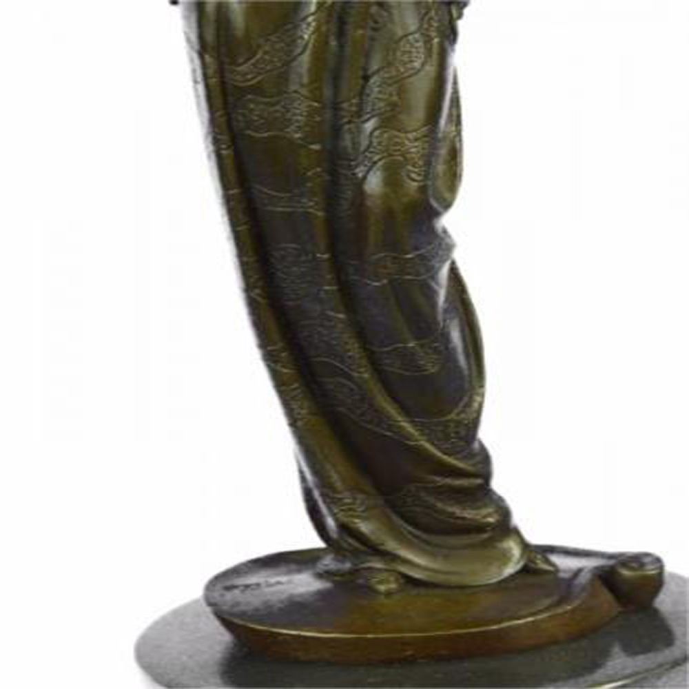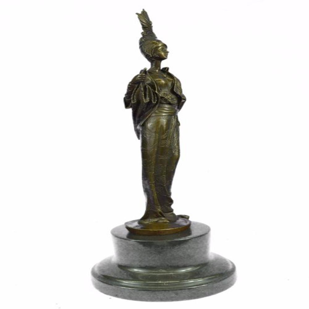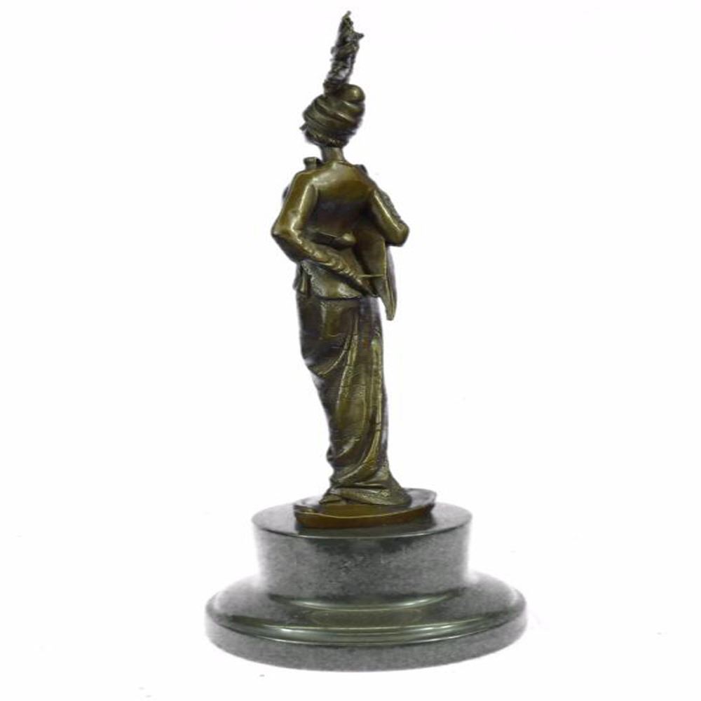 This Sculpture of a 1920s woman is a beautiful piece for an exquisite living room or a young ladys bedroom. As she stands elegantly for her photoshoot, who can forget to mention her unforgettable dress that drops all the way to the floor, while she holds an umbrella under her right arm. The details on her neckless,waist belt, over coat, and her Charleston hat, are unbelievably carved leaving her picture perfected. This is a beautiful Bronze Sculpture cast using the Lost Wax Method and has a gorgeous brown patina and it is mounted on a marble base. Bronze Dimensions with Marble Base: Height 18 X Width 6 inches. Weight: 11 LBS.