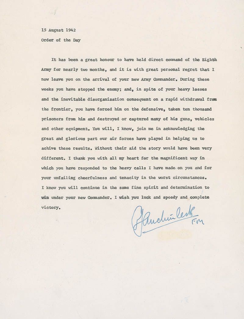 British army commander during World War II (1884–1981). Souvenir typescript, signed “C. Auchinleck FM,” one page, 8.5 x 11. A typescript of the August 15, 1942, Order of the Day. In part: “It has been a great honor to have held direct command of the Eighth Army for nearly two months, and it is with great personal regret that I now leave you on the arrival of your new Army Commander…I thank you with all my heart for the magnificent way in which you have responded to the heavy calls I have made on you.” In fine condition, with some scattered light creasing and toning.