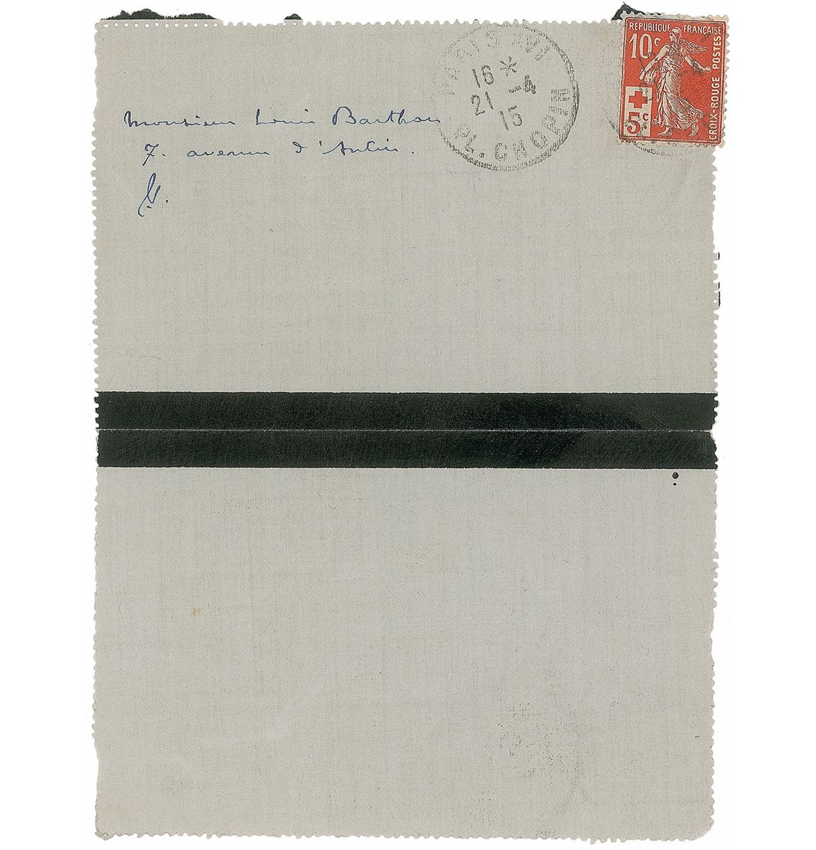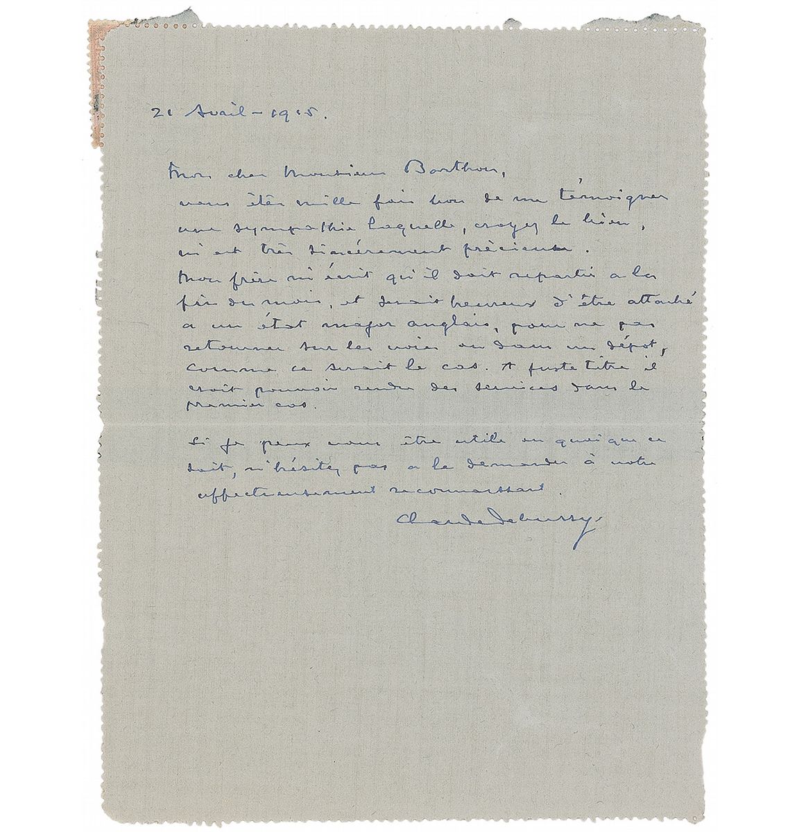 Important French composer (1862–1918) whose colorful, evocative works, particularly those for keyboard and for orchestra, exemplified the ‘impressionist’ style. Neatly penned ALS in French, one page, 4.5 x 5.75, April 21, 1915. Letter to French minister Louis Barthou requesting a favor for his brother, a soldier in WWI. In part (translated): “You are a thousand times good to show me a sympathy which, believe it well, is very valuable, sincerely. My brother writes that he has to start at the end of the month and would be happy to be attached to an English major…Rightly he thinks he can be of service…If I can help you with anything, do not hesitate to ask.” Addressed on the reverse in Debussy’s hand. In fine condition.