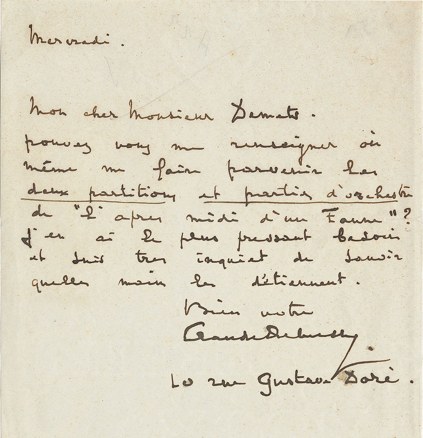 ALS in French, one page, 5 x 5.25, no date. Letter to “Mr. Demats,” in part (translated): “Can you please try and send to me the two scores of ‘l’apres-midi d'un faune’ [Afternoon of a Faun]? I need them very urgently and I’m very worried to know in which hands they are now.” In fine condition. Debussy's symphonic poem 'Prélude à l'après-midi d'un faune' [Prelude to the Afternoon of a Faun], one of his most famous works, would provide the basis for the Nijinsky ballet Afternoon of a Faun. A beautiful, boldly penned letter concerning an important work.