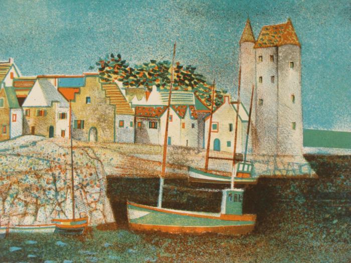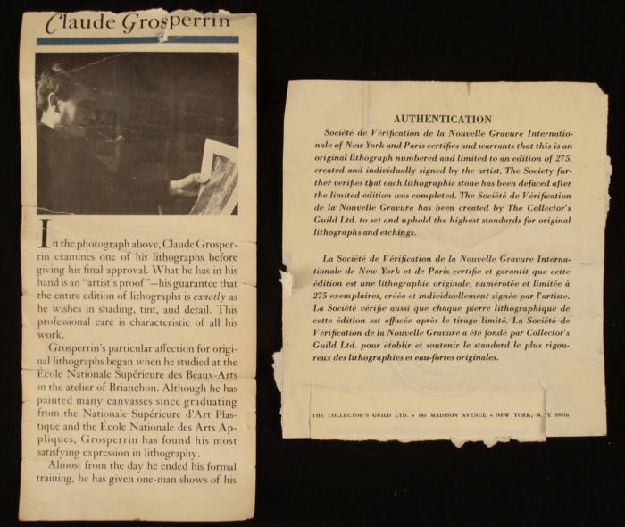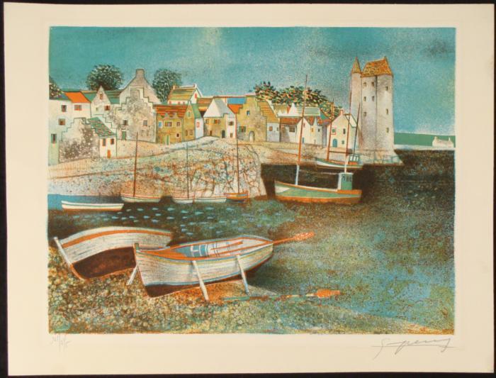 This is an original print by noted 20th century French Impressionist Claude Grosperrin. The scene portrays a harbor in a quiet village, with bright primary colors that convey the warmth and anticipation of a warm sunny day. Artist: Claude GrosperrinMedium: Lithograph on paper Publisher: The Collector's Guild, New YorkSignature: Signed by the artist in pencil, lower rightEdition: Numbered 101/215, in pencil, lower left Image size: 13 x 17 1/4 inches Sheet size: 15 5/8 x 20 5/8 inches Condition: Very good; slight lines bordering the image in the margins; slight stain spots on the upper right and lower left edges, easily matted out Also included: Brief artist biography, and Certificate of Authentication (in French, with embossed seal), both from the publisher We have not seen any prints like this by Grosperrin, so we believe this one might be rare. It is certainly a fine example of a traditional composition, and vibrant pallate. Biography