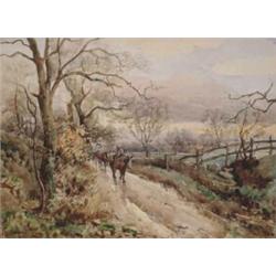 Claude Hayes RI ROI (1852-1922) A RIDER LEADING A PACK OF HORSES DOWN A COUNTRY LANE signed...