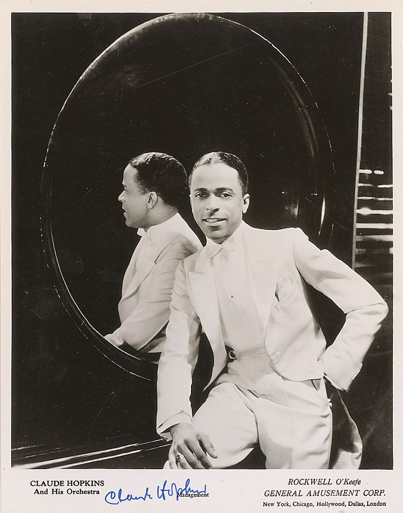 Jazz stride pianist and bandleader (1903–1984) who played at the Savoy and Roseland ballrooms and the Cotton Club. Glossy 8 x 10 publicity photo of Hopkins in a bright white suit, signed in the lower border in blue felt tip. Light scattered creases and surface spotting, otherwise fine condition.