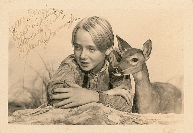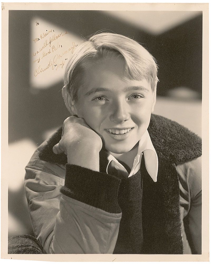 His sensitive, believable performance in The Yearling won him a special 1946 Oscar for ‘most outstanding child performer of the year.’ Two vintage photos, one 8 x 10 and one 5 x 3.25, each signed and inscribed in fountain pen to assistant director George Rhein. In fine condition, with both signatures and inscriptions light, but still legible, and mild rippling to horizontal edges of 8 x 10 photo.