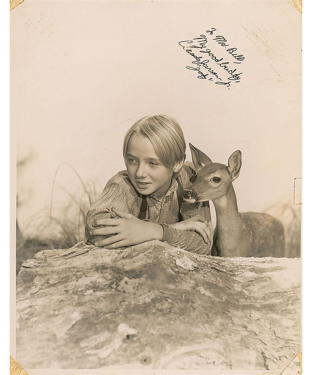 Vintage glossy 10 x 12.75 photo of the young actor from The Yearling, signed and inscribed in fountain pen to 1940s–1950s MGM entrance gate security officer Bill Ludlow, “To Mr. Bill, My good buddy, Claude Jarman, Jr., ‘Jody’.” Slightly trimmed edges, tape and adhesive remnants to edges and corners, and some soiling above inscription, otherwise fine condition.