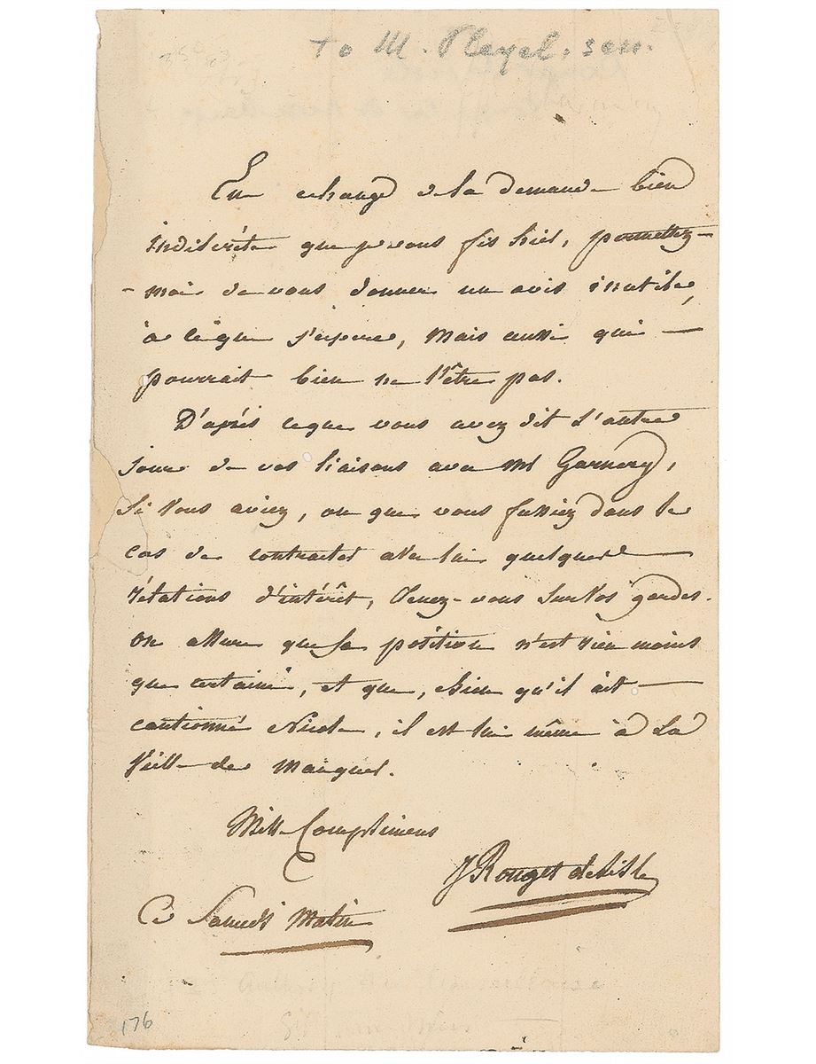 French army officer and composer (1760–1836) who wrote the words and music to the French national anthem, La Marseillaise. ALS in French, signed “J. Rouget de Lisle,” one page, 4.75 x 7.75, no date. Untranslated. Intersecting folds (one vertical fold passing through a single letter of the signature), repaired tears and paper loss to left edge (affecting a couple words), and a few small holes to the body, otherwise fine condition.