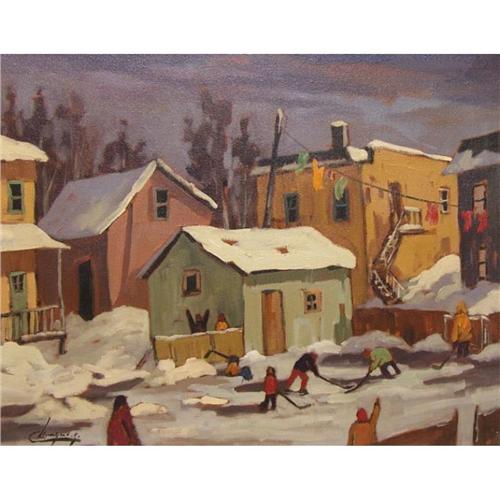 Canadian [b. 1942] HOCKEY DANS LA COUR oil on canvas 16 x 20 in. (40.6 x 50.8 cm) signed & titled
