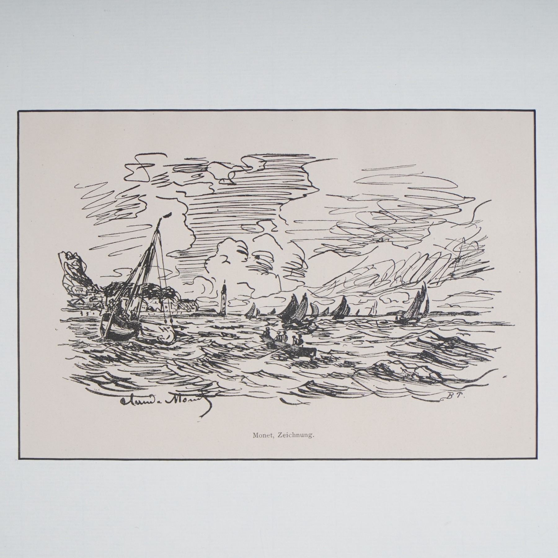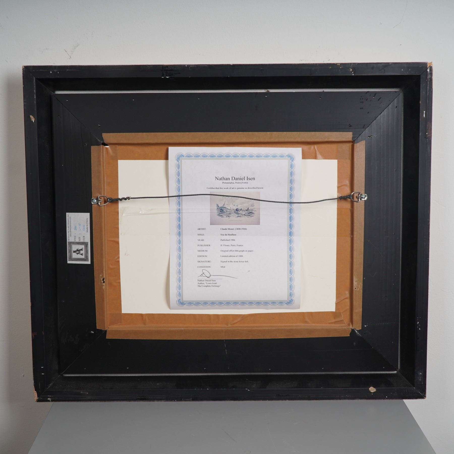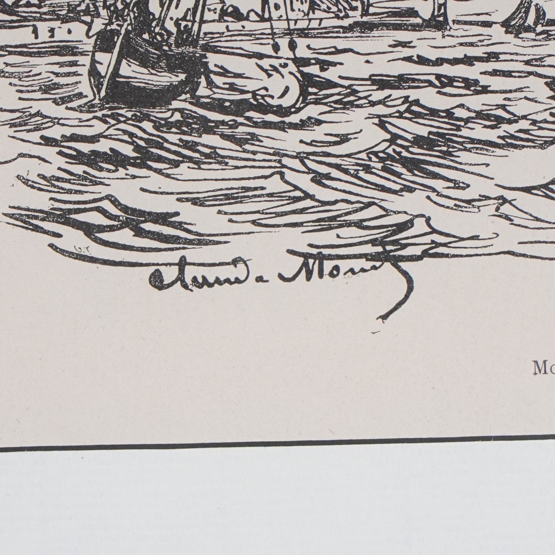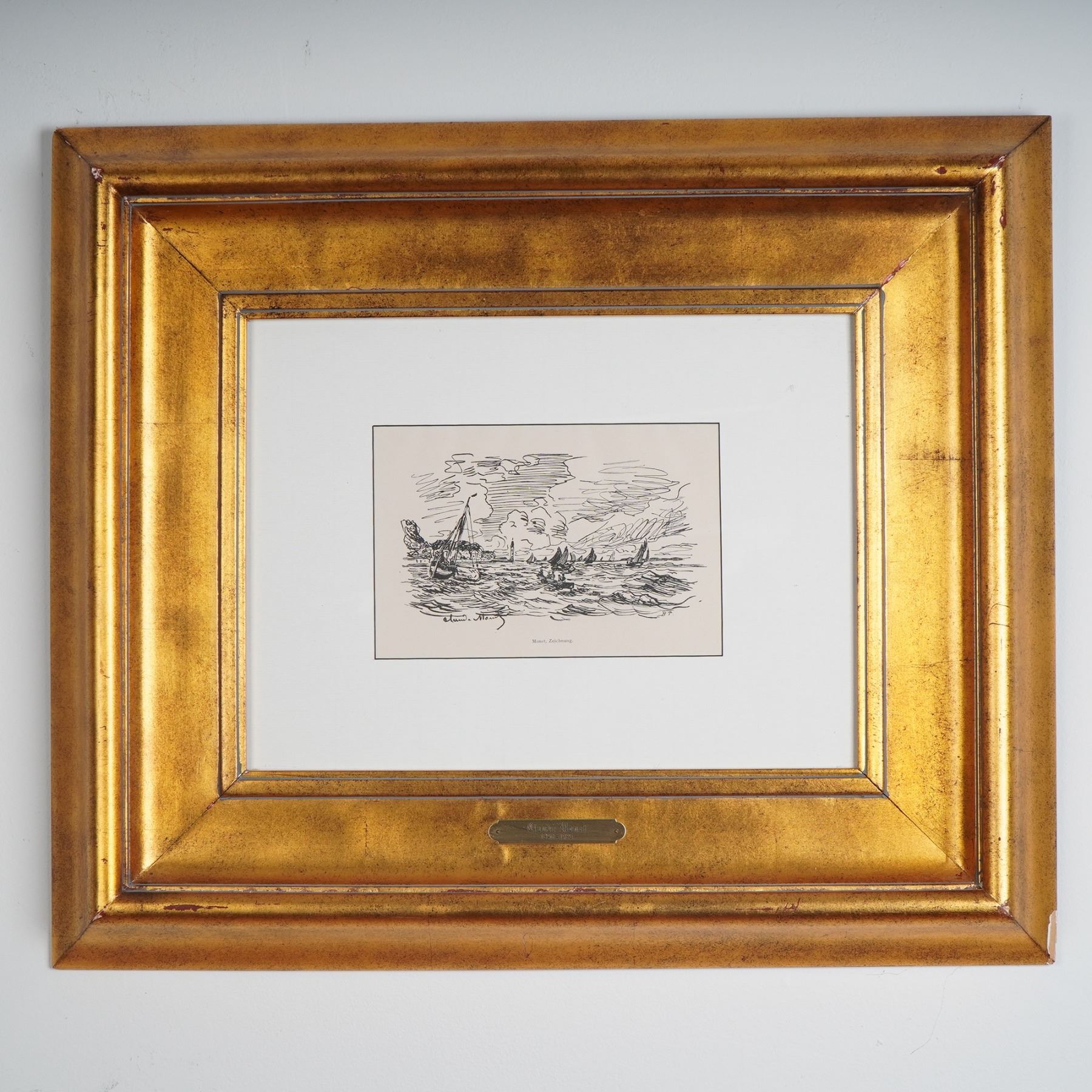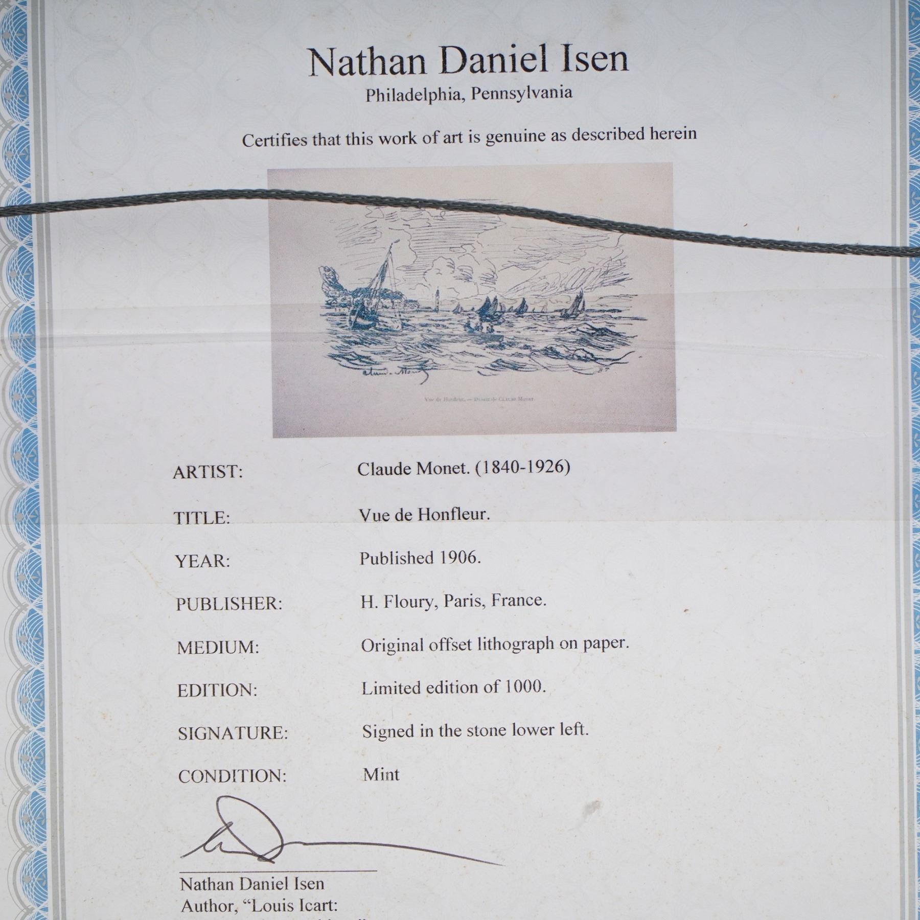 Offset lithograph titled Vue de Honfleur, after an original composition by Claude Monet. Published in 1906 by H. Floury, Paris, this piece was produced in a limited edition of 1000 impressions. Printed on paper and signed in the stone lower left, the image captures Monet's lively linework and maritime atmosphere in a refined, monochrome presentation. Professionally matted and set in a classic gold gilt frame, this work is accompanied by a certificate of authenticity from Nathan Daniel Isen.