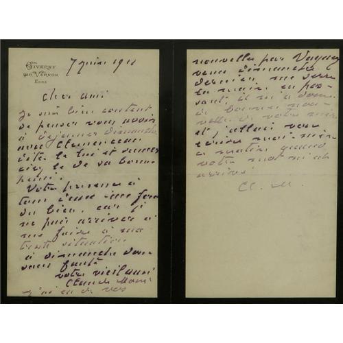 <B>Claude Monet Autograph Letter Signed</B></I> ,"<I> Cl. M</B></I>". 3 pages, 4.5" x 7.5", with stamped postal cover, Eure, France, June 7, 1911 to G. Geffieny, Paris. Impressionism's superstar, Claude Monet, wrote here in purple ink on a letterhead imprinted "Giverny", the locale of his home and backdrop for many of his most beloved works. Light browning, uneven ink impressions. Fine condition. Framed with a brass nameplate and high resolution halftone photograph of Monet. 26.5" x 23" overall.