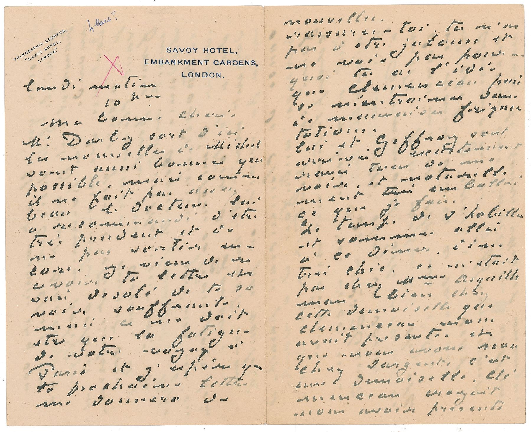 ALS in French, signed “Claude,” eight pages on two sets of adjoining sheets, 5 x 8, Savoy Hotel letterhead, February 26, 1900. A long letter to his wife about his life and work in London. He gives news of the health of their son Michel, and hopes that his wife has recovered from the fatigue of her trip to Paris. In part (translated): "Rest assured, you don't have to be jealous and don't see why you have the idea that Clemenceau could drag me into bad company. He and Geffroy arrived delighted to see me, and naturally very excited about what I'm doing. The time to get dressed went to this dinner, a very chic dinner, it wasn't at Mrs. Asquith's, but at this lady whom Clemenceau had introduced us to and whom we met again at Sargent's…There were many politicians, including one of the present ministers, and I assure you that it was interesting Clemenceau having his frank conversation with them. There was of course Mr. and Mrs. Asquith (Margot), an extraordinary man, who is going to send me the authorization to paint in the Tower of London. Sargent had been invited, but could not come, or did not want to because of Clemenceau, it seems, because in the past he wanted to do his portrait and missed it completely…I'm taking advantage of the very thick fog that keeps me from working to write to you a little longer. My friends are coming to see me…They are going to go to the museums…This morning at dawn there was an extraordinary fog, completely yellow. I made an impression of it, I think, it's always beautiful, but it's also so changeable that I had to start a lot of paintings of the Waterloo Bridge and the Parliament. I also took back several paintings from the first trip, some not so good ones. It's also here that I'm working the most so far, going to the hospital only at 4pm. Alas the fog won't lift and I'm afraid I'll lose my morning…But there he is, showing his face the sun." In fine condition.