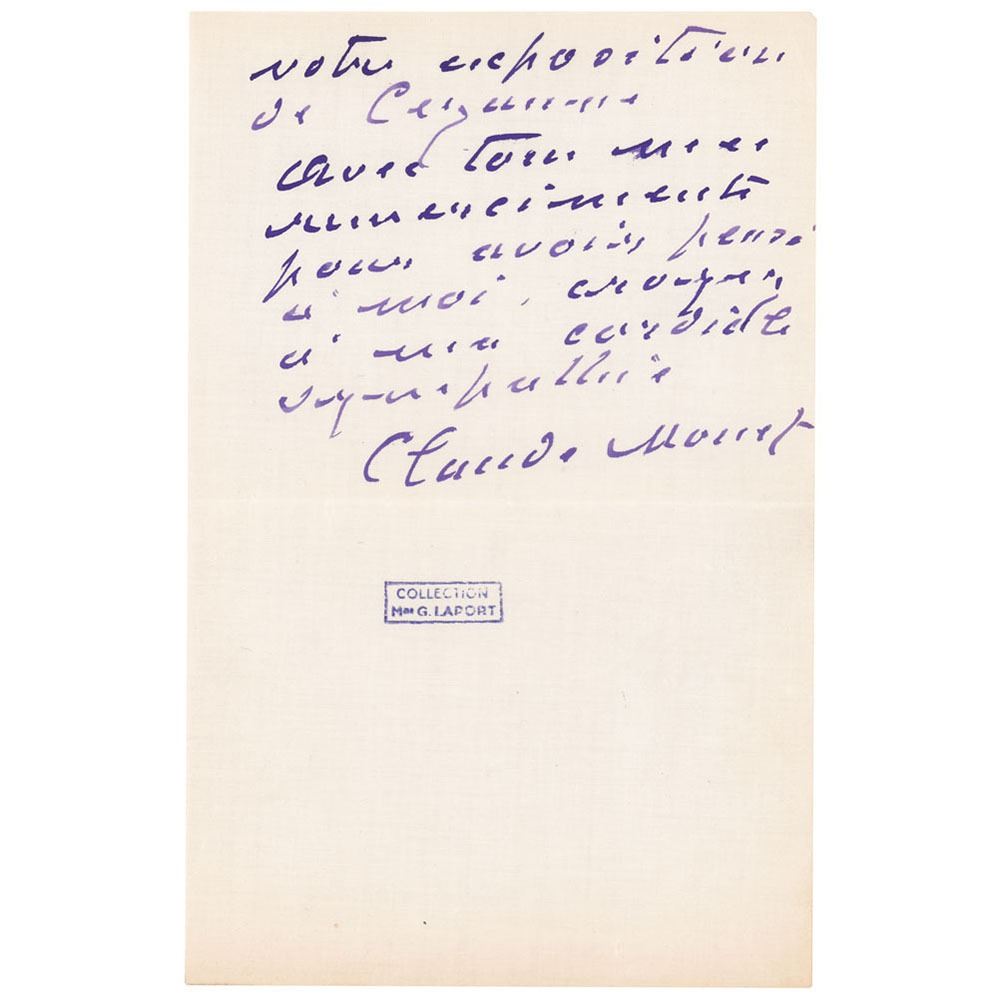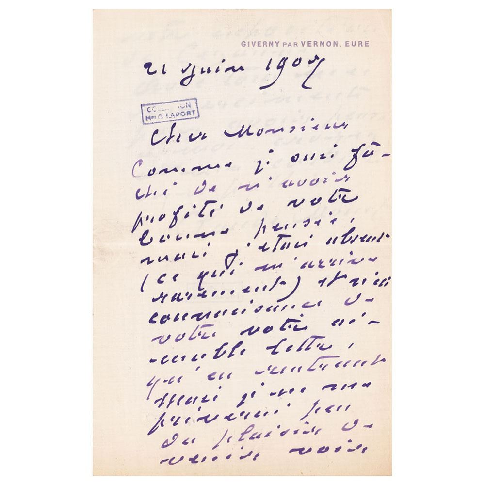 ALS in French, two pages on two adjoining sheets, 5.25 x 8, Giverny par Vernon letterhead, June 21, 1907. Boldly penned handwritten letter, in full (translated): "I am quite upset that I was unable to take advantage of your good thought, but I was away (which I rarely am) and I was unaware of your letter until my return, but I will not deprive myself of the pleasure of coming to see your Cezanne exhibition. With all my thanks for thinking of me, please believe in my sincere sympathies." In fine condition, with "Collection Mme. G. Laport" ink stamps to both pages. Monet is most likely referring to the first posthumous retrospective of Paul Cezanne's work at the Salon d'Automne in 1907, which displayed 56 canvases as a tribute to the influential painter's life and work. A superb letter on an esteemed contemporary.