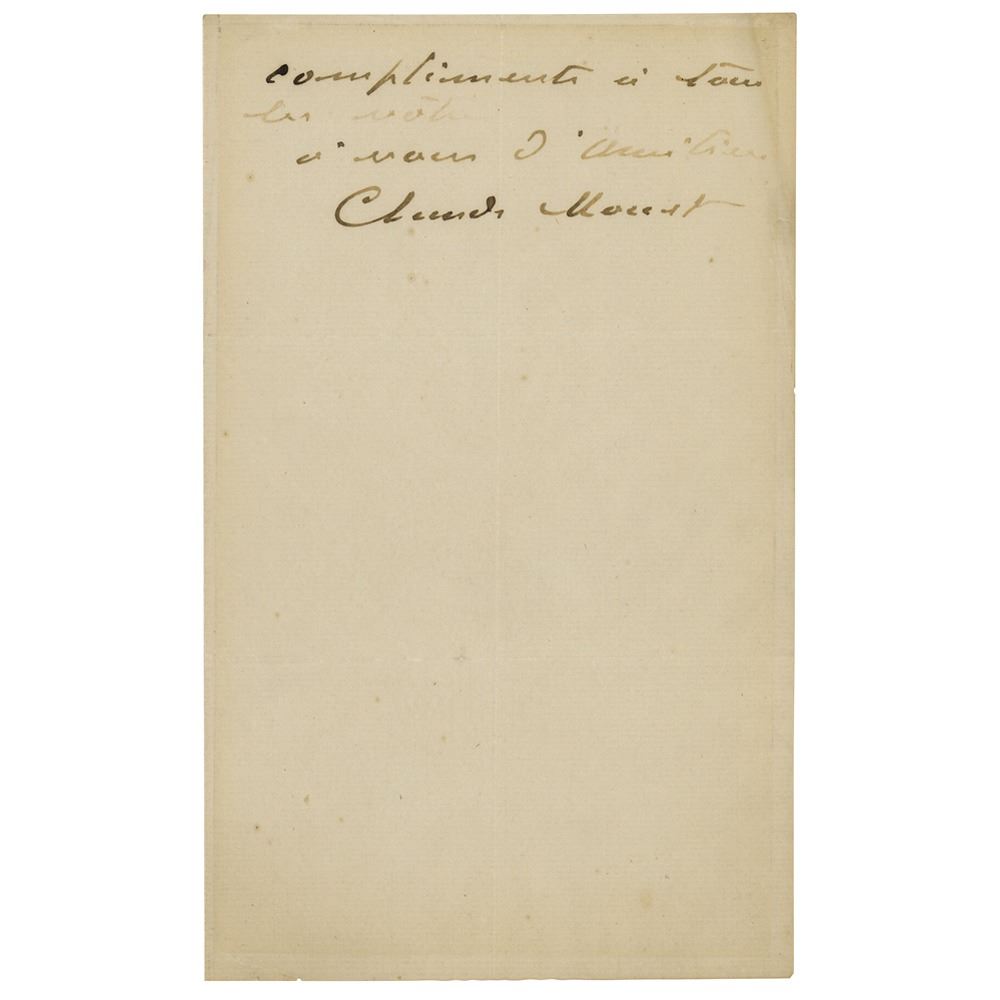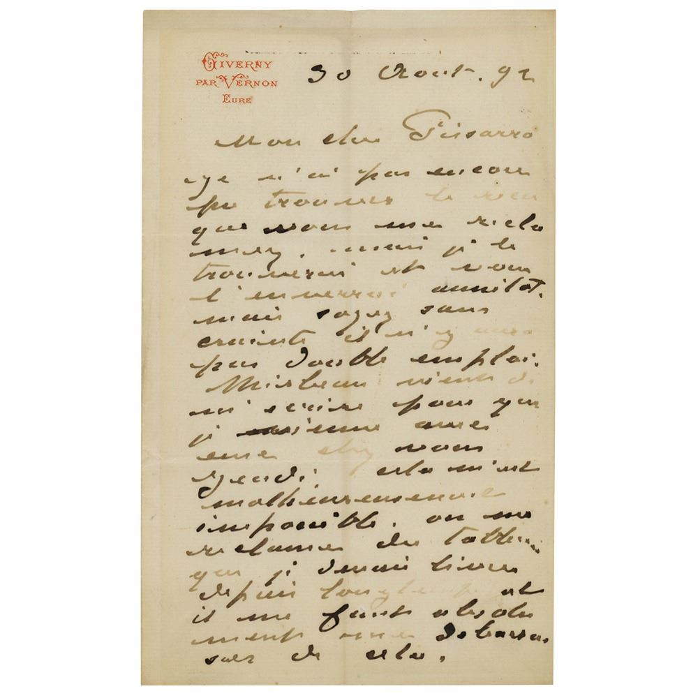 ALS in French, two pages, 5.25 x 8.5, Giverny par Vernon letterhead, August 30, 1892. Handwritten letter to fellow painter Camille Pissarro, in part (translated): "I haven't been able to find the receipt you've asked for yet, but I'll find it and send it to you right away. But don't worry there is no duplication. Mirbeau has just written to me asking me to come with them to your house on Thursday. Unfortunately, this is impossible for me. They are asking me for paintings I was supposed to have delivered a long time ago, and I absolutely have to deal with that." In fine condition, with faint toning from prior display.