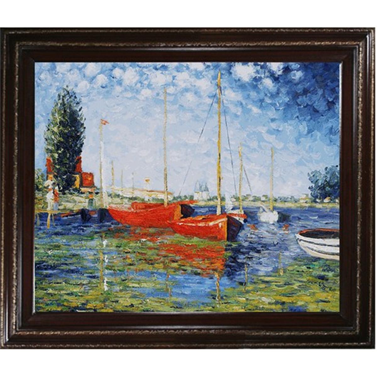 Hand painted oil reproduction of a famous Monet painting, Red Boats at Argenteuil. The original was done in 1875, today it has been carefully recreated detail-by-detail, color-by-color to near perfection. 20x24 MON1022 OS00225 (Heritage Wood Frame Cherry Finish)