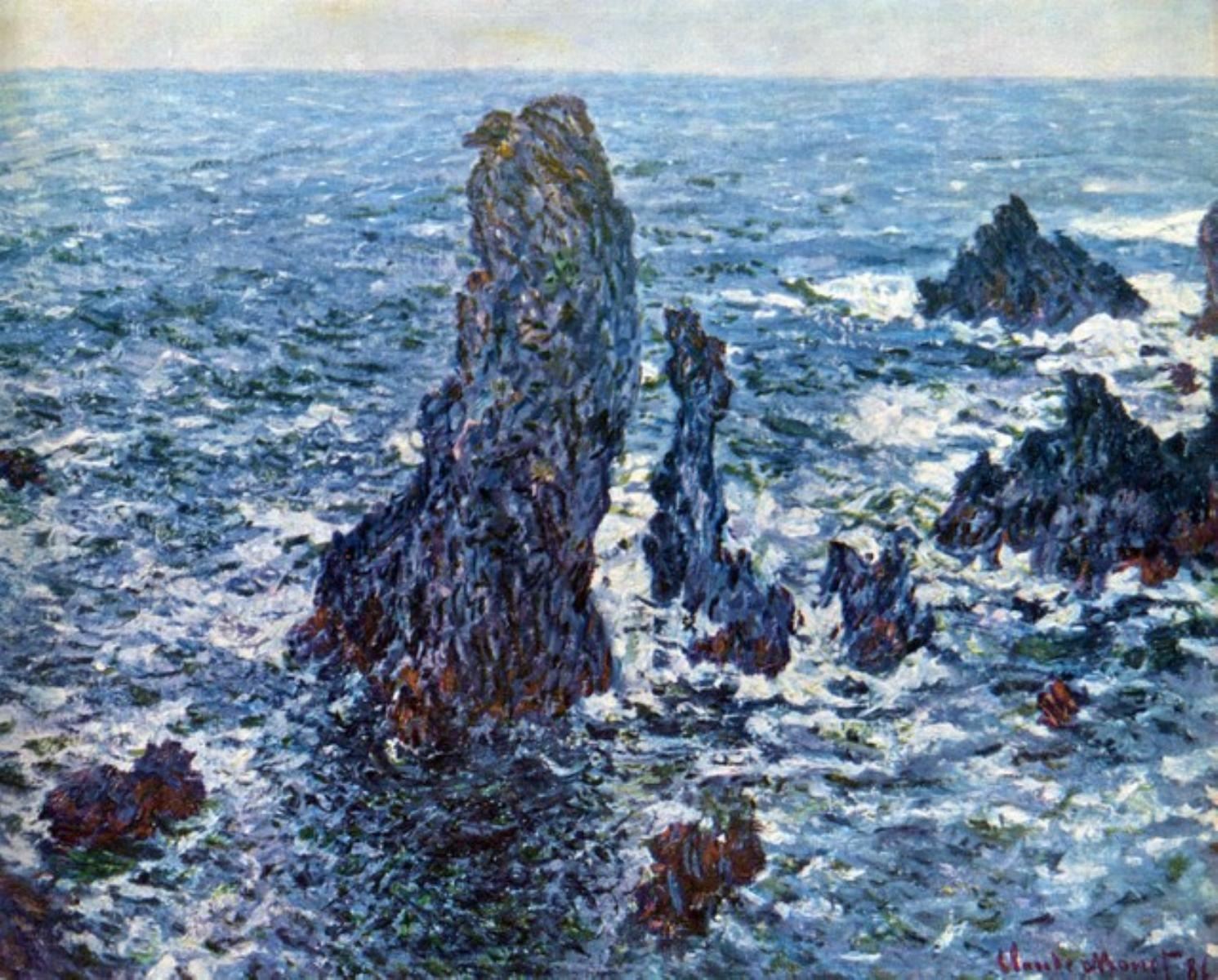 Artist: Claude Monet - Title: Rocks on Belle-Ile (The needles of Port-Coton) - Medium: Fine Art Reproduction Giclee on Canvas - Image Size: Approximately 16 inches x 20 inches - Unframed on Unstretched Canvas - Biography: Claude Monet was born on November 14, 1840, in Paris, France. He enrolled in the Academy Suisse. After an art exhibition in 1874, a critic insultingly dubbed Monet's painting style "Impression," since it was more concerned with form and light than realism, and the term stuck. Monet struggled with depression, poverty and illness throughout his life. He died in 1926.