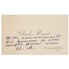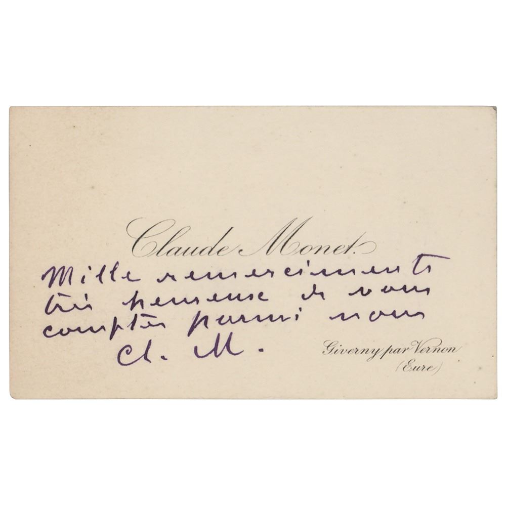 Personal calling card belonging to Claude Monet, 3.75 x 2.25, who has signed in purple ink, "Cl. M.," and added a brief sentiment in French above. In fine condition.