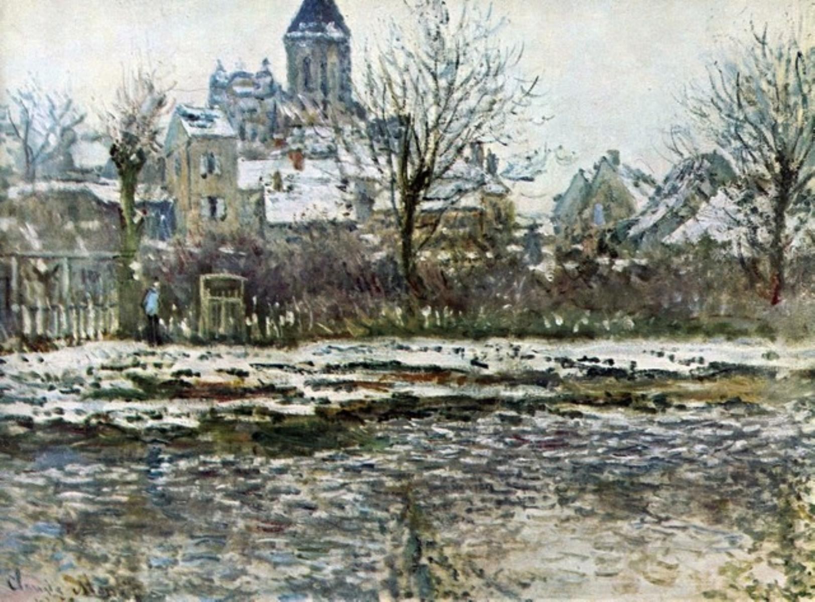 Artist: Claude Monet - Title: Snow in Vetheuil - Medium: Fine Art Reproduction Giclee on Canvas - Image Size: Approximately 14.75 inches x 20 inches - Unframed on Unstretched Canvas - Biography: Claude Monet was born on November 14, 1840, in Paris, France. He enrolled in the Academy Suisse. After an art exhibition in 1874, a critic insultingly dubbed Monet's painting style "Impression," since it was more concerned with form and light than realism, and the term stuck. Monet struggled with depression, poverty and illness throughout his life. He died in 1926.