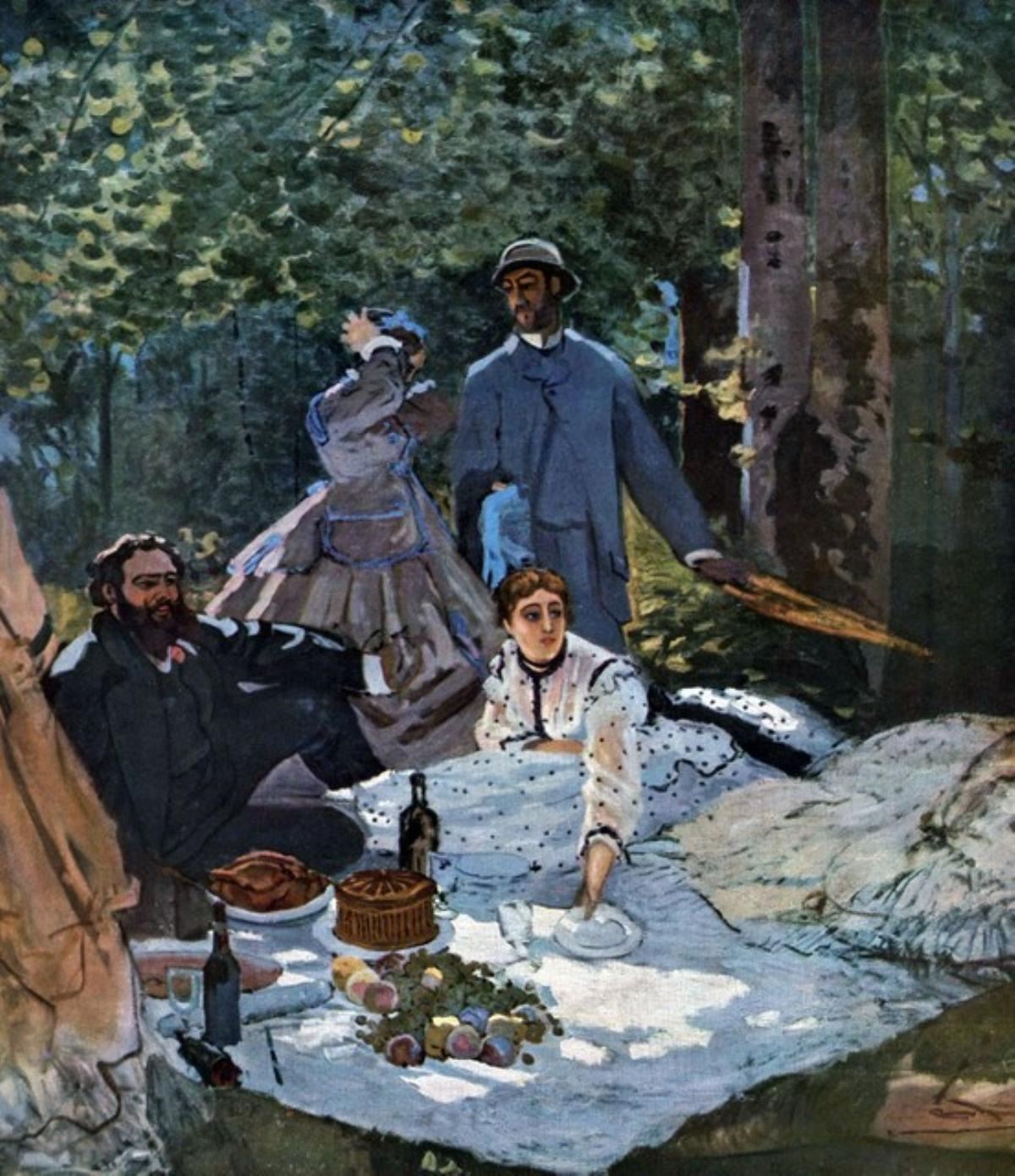 Artist: Claude Monet - Title: The Breakfast Outdoors, Central Section - Medium: Fine Art Reproduction Giclee on Canvas - Image Size: Approximately 20 inches x 17.25 inches - Unframed on Unstretched Canvas - Biography: Claude Monet was born on November 14, 1840, in Paris, France. He enrolled in the Academy Suisse. After an art exhibition in 1874, a critic insultingly dubbed Monet's painting style "Impression," since it was more concerned with form and light than realism, and the term stuck. Monet struggled with depression, poverty and illness throughout his life. He died in 1926.