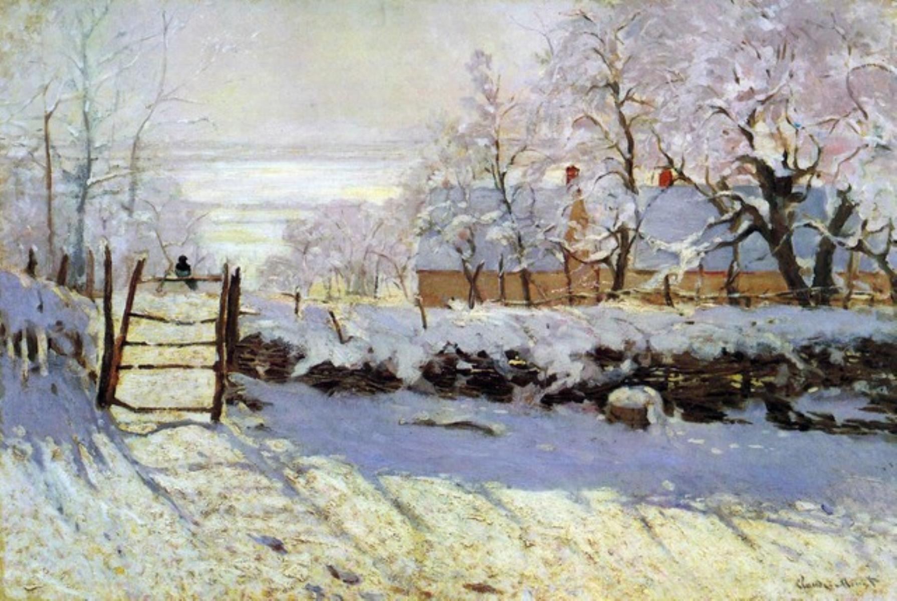 Artist: Claude Monet - Title: The Magpie - Medium: Fine Art Reproduction Giclee on Canvas - Image Size: Approximately 13.5 inches x 20 inches - Unframed on Unstretched Canvas - Biography: Claude Monet was born on November 14, 1840, in Paris, France. He enrolled in the Academy Suisse. After an art exhibition in 1874, a critic insultingly dubbed Monet's painting style "Impression," since it was more concerned with form and light than realism, and the term stuck. Monet struggled with depression, poverty and illness throughout his life. He died in 1926.
