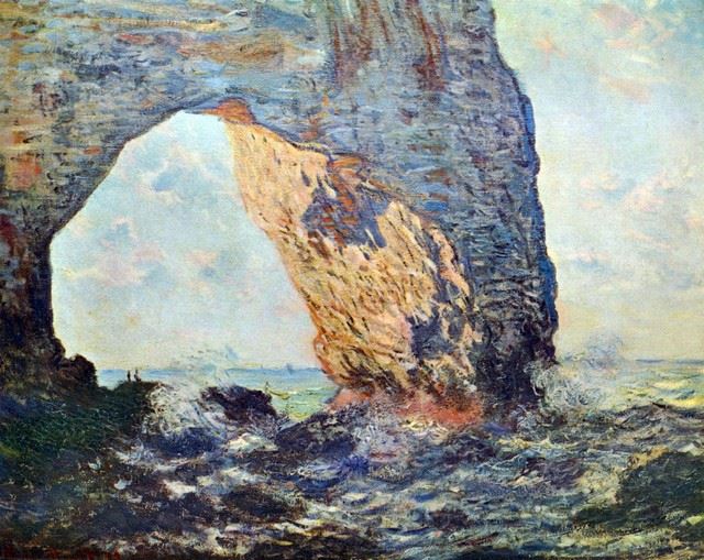 Artist: Claude Monet - Title: The Rocky Cliffs of Étretat (La Porte Man) [1] - Medium: Fine Art Reproduction Giclee on Canvas - Image Size: Approximately 16 inches x 20 inches - Unframed on Unstretched Canvas - Biography: Claude Monet was born on November 14, 1840, in Paris, France. He enrolled in the Academy Suisse. After an art exhibition in 1874, a critic insultingly dubbed Monet's painting style "Impression," since it was more concerned with form and light than realism, and the term stuck. Monet struggled with depression, poverty and illness throughout his life. He died in 1926.