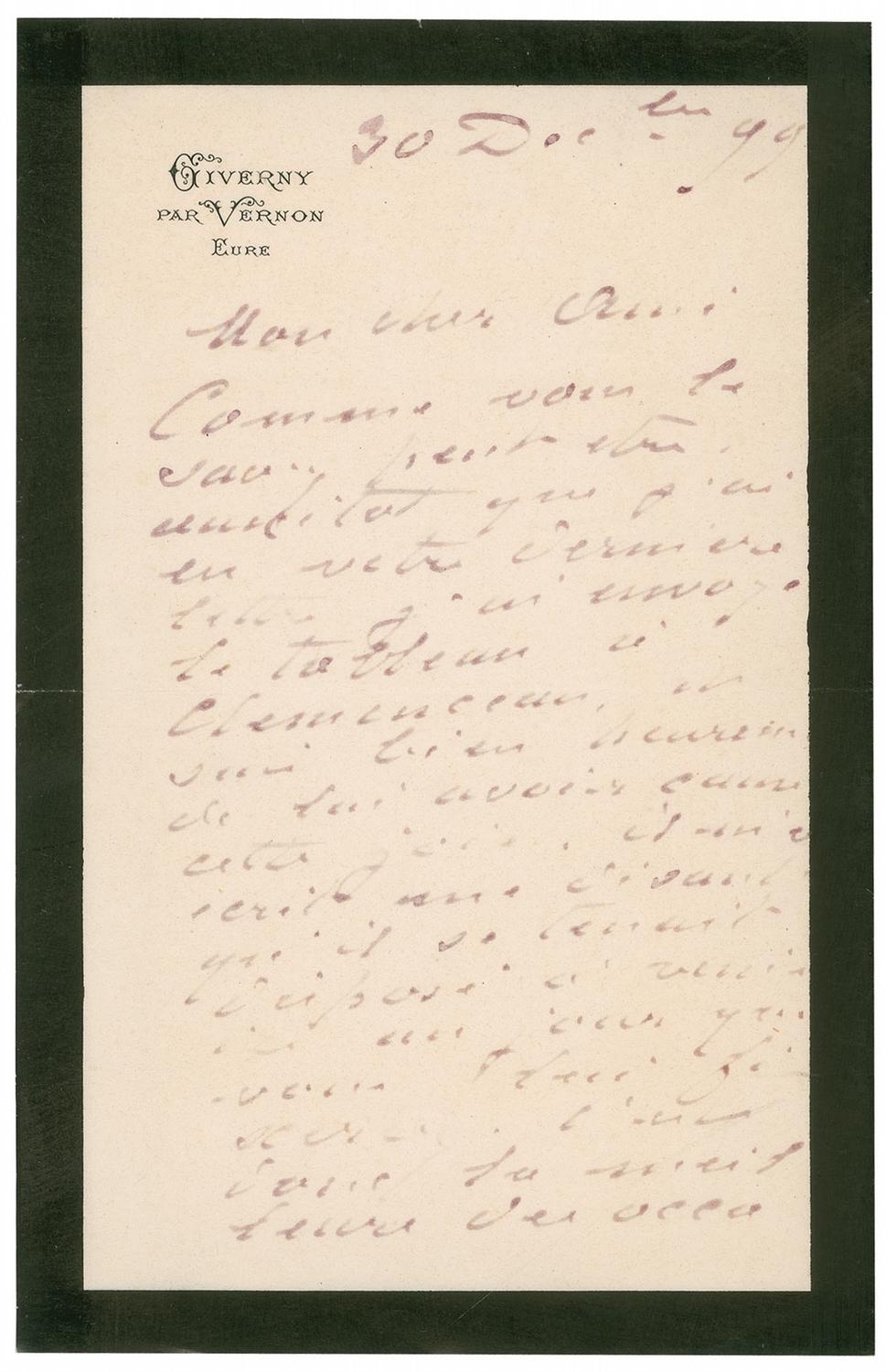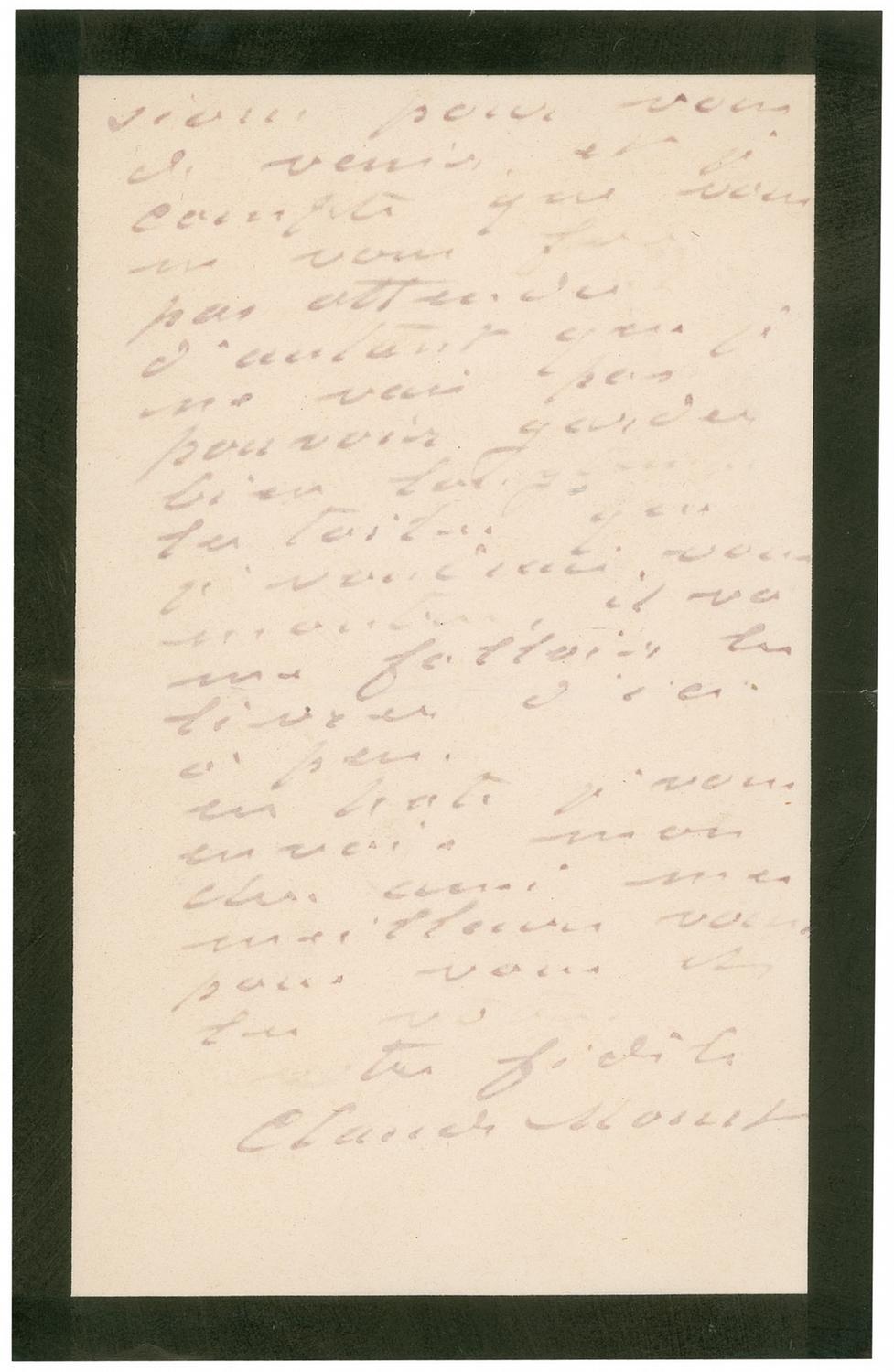 Highly influential French painter (1840–1926) who was among the leading figures of the impressionist movement, which took its name from the title of one of Monet’s works. ALS in French, two pages, 5.25 x 8, black-bordered Giverny par Vernon Eure letterhead, December 30, 1899. Letter to Mr. G. Geffroy. In full (translated): “As you know very well perhaps that as soon as I received your last letter I had sent the painting to Clemenceau. He has written to me saying that he was disposed to come here and I will show him Giverny. It is therefore the best time for you to come. I count on you that you will not keep us waiting. Particularly because I will not be able to keep the canvas very long that I would like to show you. I will have to deliver it shortly. In haste, I send you my dear friend and your family my best wishes.” All Monet’s writing and signature a few shades light, but still completely legible, a central horizontal fold, some light edge creases, and tape remnants along top edge of reverse, otherwise fine condition. Accompanied by the original mailing envelope addressed in Monet’s hand.