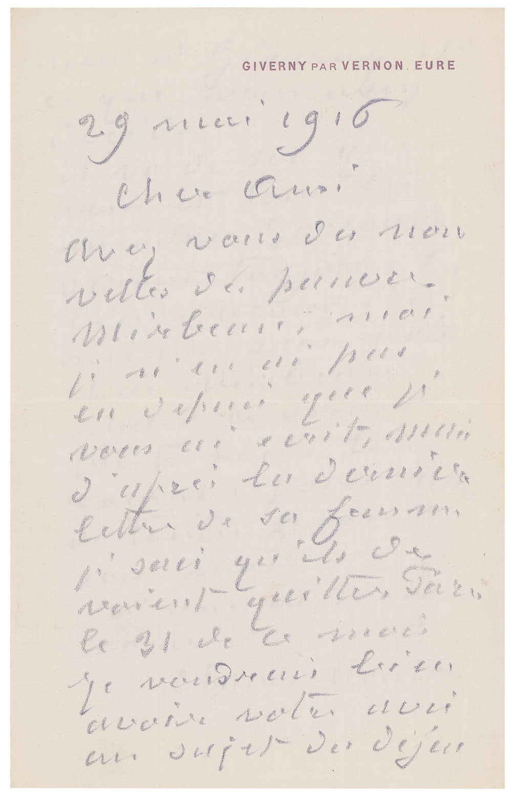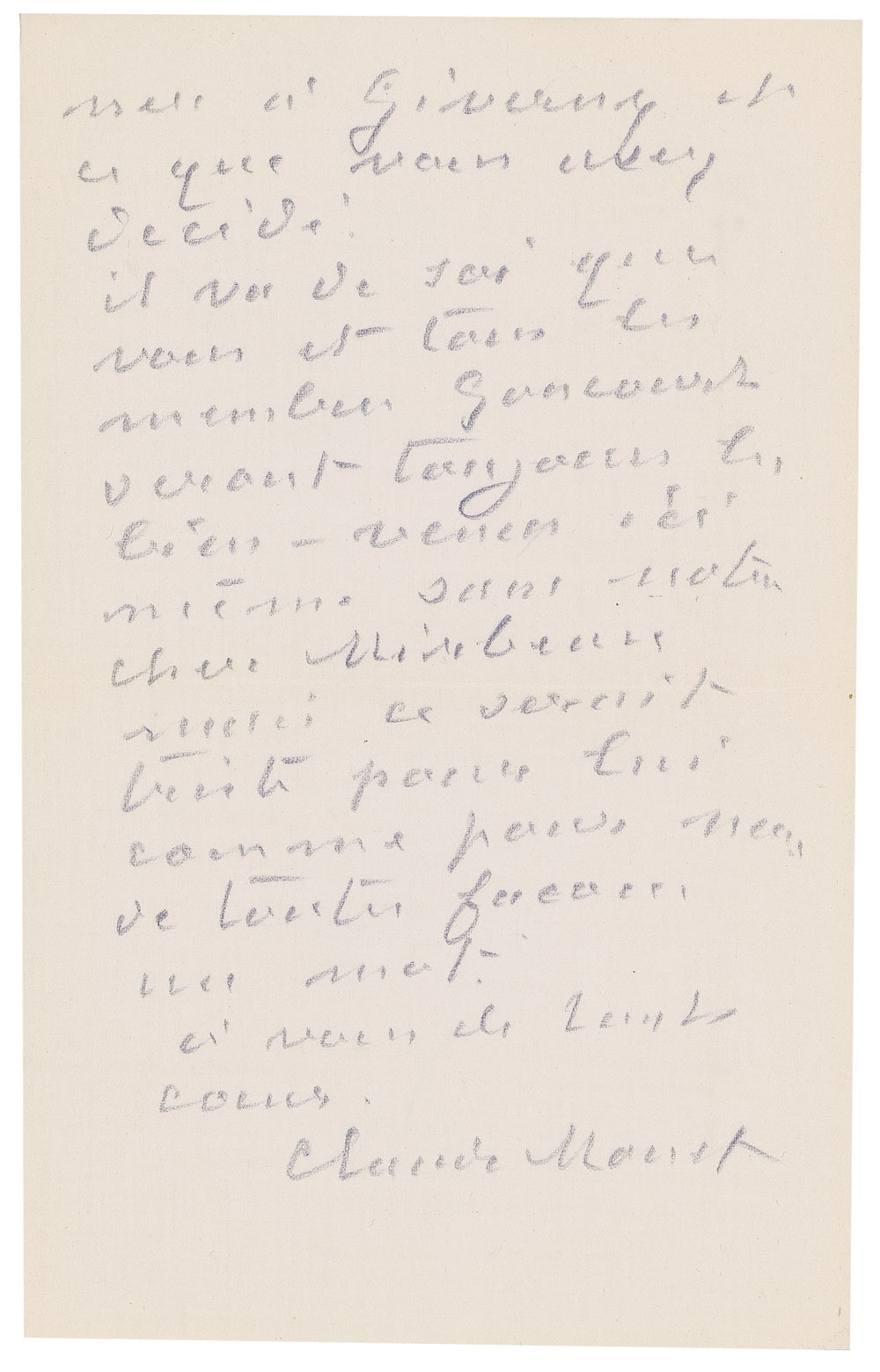 Monet had completed construction of an art studio next to his country home, Giverny—where he created his beloved ‘Water Lilies’ collection—the same year he sent this letter to Geffroy, president of the l’Académie Goncourt, whose members had an open invitation to visit “even without our dear Mirabeau.” Octave Mirbeau was a French writer, art critic, and playwright, who died less than a year later. Geffroy later compiled the first biography and catalog of Monet's work, sending the artist written questions, to which he famously responded with one-word answers—resulting in an important but unreliable piece.