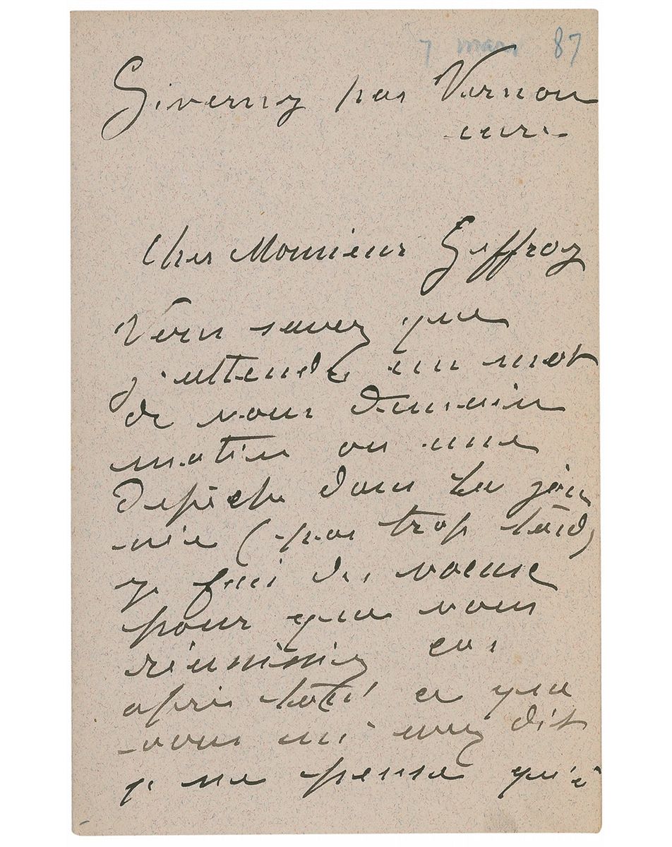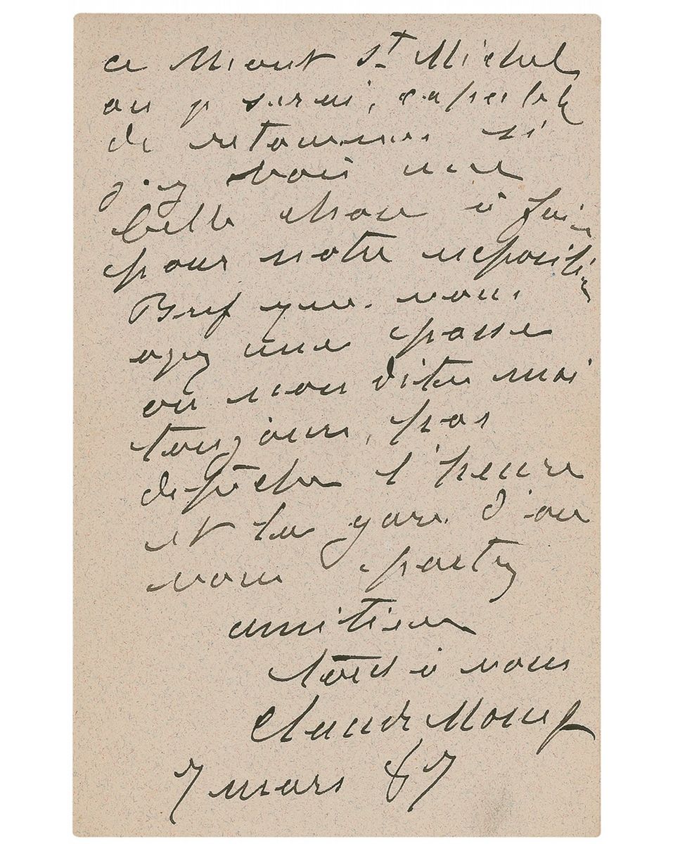 ALS in French, two pages on two adjoining sheets, 4.5 x 7, March 7, 1887. Letter to art critic G. Geffroy. In full (translated): “You know that I am expecting a word from you tomorrow morning or a telegram later (but not too late). I wish you success, for after all you’ve told me, my only thought is that of Mont St. Michel where I could possibly return if I see that there is a beautiful thing to paint for our exposition. In any case, let me know by telegram the hour and station at which you will arrive.” In fine condition, with light pencil notation to top and a bit of trivial soiling. Accompanied by the original mailing envelope. Mont Saint Michel is a small rocky island off the north coast of France at the mouth of the Couesnon River in Normandy, and is best known for the medieval Benedictine Abbey and steepled church that occupies most of the clump of rocks jutting out of the waters of the English Channel.