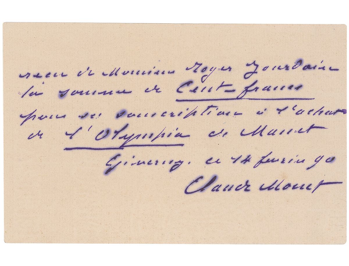 ALS in French, one page, 7 x 4.5, February 14, 1890. Letter to Roger Gourdain acknowledging a 100 franc subscription toward the purchase of Manet’s ‘Olympia.’ In full (translated): “Received from Mr. Roger Gourdain the amount of one hundred francs for the subscription of the purchase of the Olympia of Manet.” In very good condition, with a central vertical fold, a mild shade of toning to page, and scattered areas of ink pooling to several letters. Monet believed 'Olympia' to be an extremely important painting and spearheaded an effort to purchase it for the permanent collection of the Louvre Museum in Paris. He succeeded in 1890 and the painting is currently hung in the Musee d'Orsay, Paris.
