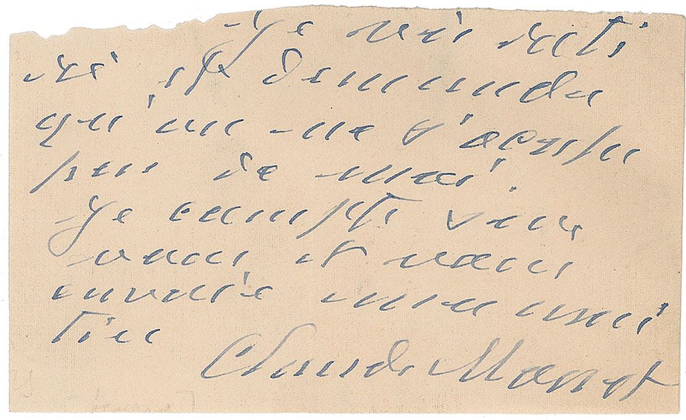 Highly influential French painter (1840–1926) who was among the leading figures of the impressionist movement, which took its name from the title of one of Monet’s works. Partial ALS in French, one page, 4.5 x 2.75, no date. Partial letter from his later