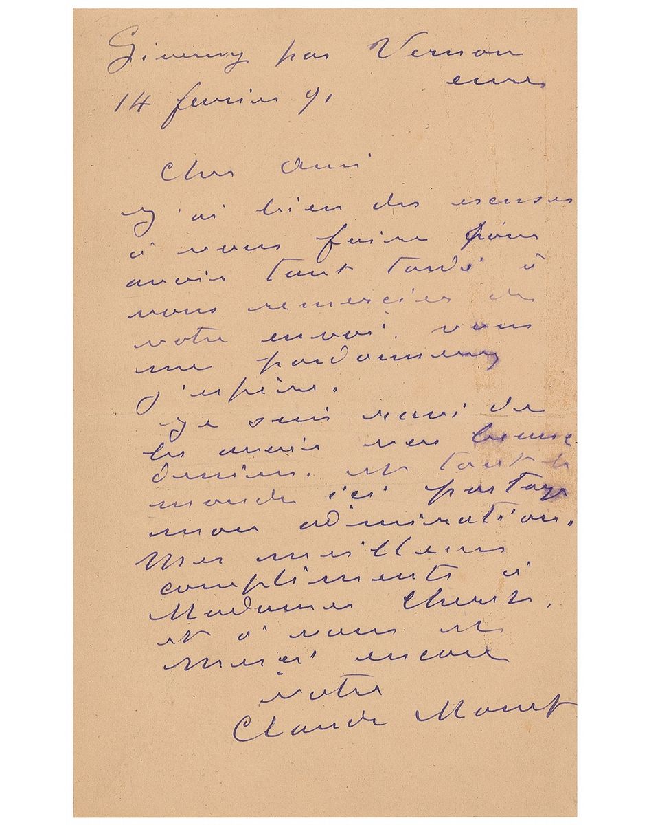 Highly influential French painter (1840–1926) who was among the leading figures of the impressionist movement, which took its name from the title of one of Monet’s works. ALS in French, one page, 4.5 x 7, February 14, 1891. Letter to his friend Jules Cheret, painter and after Toulouse-Lautrec, the most famous poster designer of his day. In full (translated): “I have many apologies to make to you for having so long delayed to thank you for your shipment. You will pardon me I hope. I am delighted to have seen them—some of them are divine—and everyone shares my admiration. My best compliments to Madame Cheret and to you and thank you again.” In fine condition, with a uniform shade of toning, a few scattered brushes to text, and some light soiling along right edge. The "shipment" Monet refers to probably contained posters, some of which Monet thought "divine."