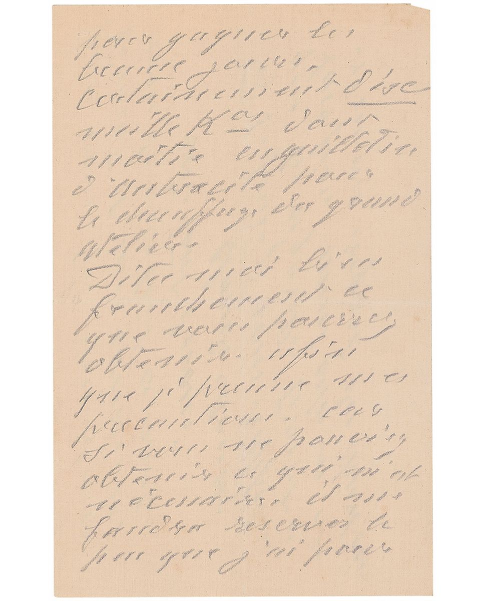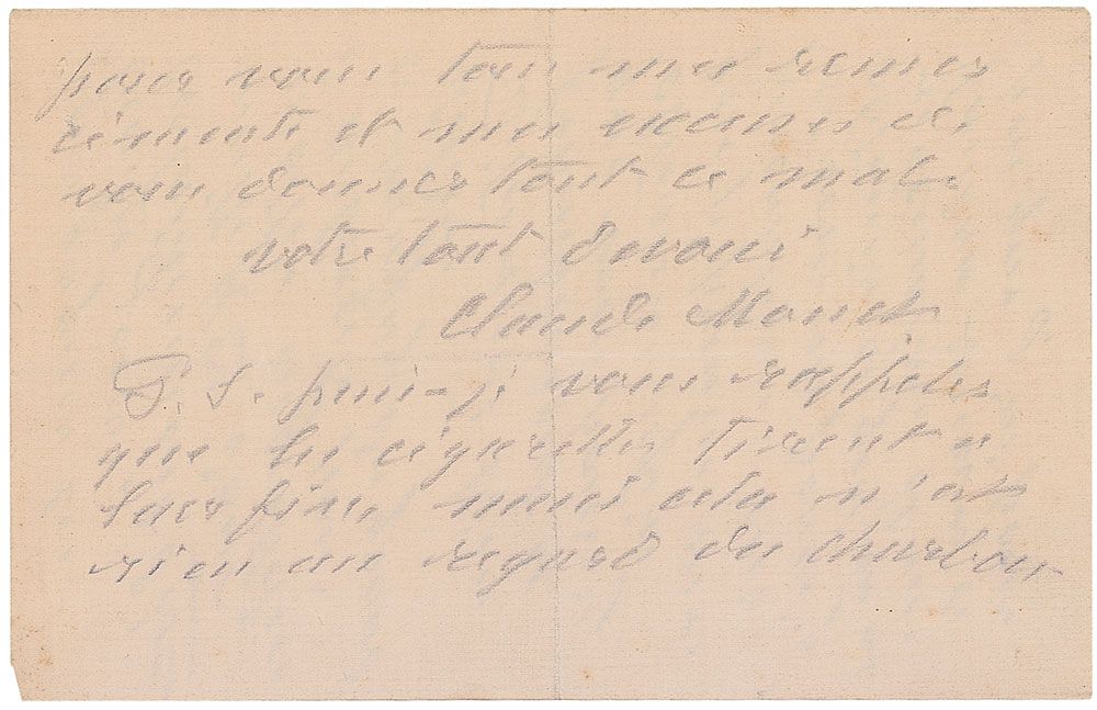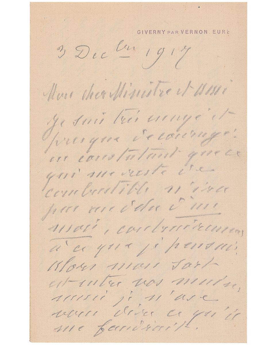 ALS in French, in pencil, four pages on two adjoining sheets, 5 x 8, Giverny par Vernon letterhead, December 3, 1917. Letter reads, in part (translated): “I am very worried and almost discouraged while noticing that what combustible [coal] I have left will not go beyond one month, contrary to what I thought. Then my fate is in your hands, so I dare not tell you what I would need until nice weather comes, certainly ten thousand kilos of which half in anthracite...to heat the big workshop. Tell me quite frankly what you could obtain so I can take precautions, because if you could not obtain what I need I would have to keep the little I have for the house up keep and then renounce totally to achieve my large work and it would be complete discouragement for me. A word, won’t you as soon as you obtain a result. I am depending on your obliging friendship. Give my respects to Madame Clementel and for you my thanks and excuses to give you so much trouble...P. S. May I remind you that the cigarettes are running out but this is nothing compared to the coal.” In fine condition, with central horizontal and vertical folds, one through a single letter of signature, and a staple hole to top left corner. Monet’s house, gardens, and workshop were in Giverny, the setting of his famous water lily paintings. Monet letters are always in extremely high demand, and this example is particularly desirable because of the direct reference to his workshop and work.