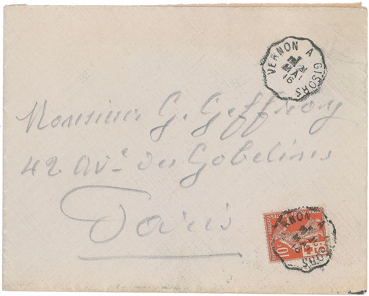 Hand-addressed mailing envelope, 5 x 4.25, addressed in pencil by Monet to influential art critic and author Gustave Geffroy, “Monsieur G. Geffroy, 42 Ave. des Gobelins, Paris.” Envelope bears an affixed 10-cent French postage stamp and is postmarked Vernon A Gisors, May 16, 1922. In fine condition. Geffroy was a founding member of the literary organization Academie Goncourt in 1900 and noted as one of the earliest historians of the Impressionist movement. He knew and championed Monet after meeting him in Belle-Ile-en-Mer in 1886, where Monet was working on paintings of the local oceanside rock formations which astounded the Paris art world when first exhibited in 1887.