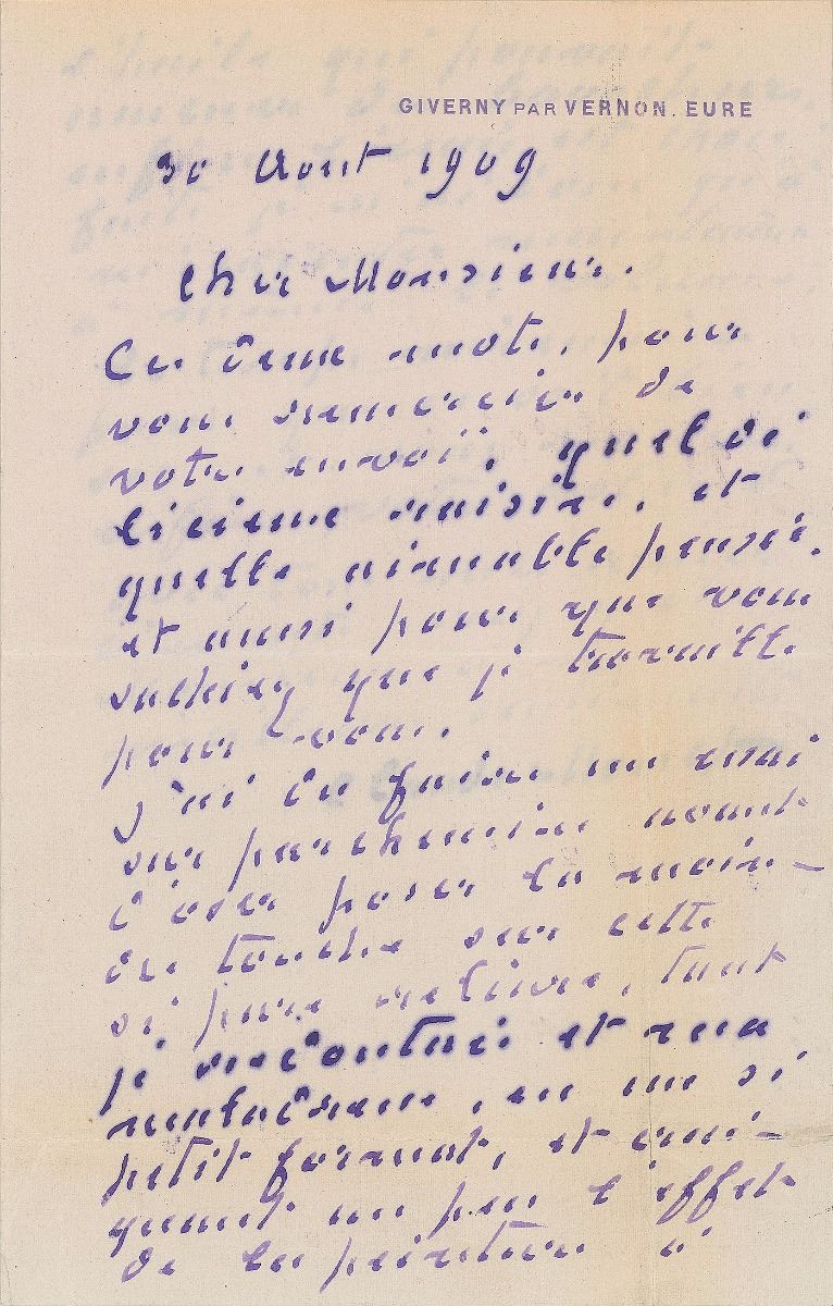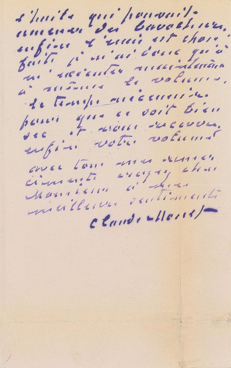 ALS in French, two pages on two adjoining sheets, 5.25 x 8, Giverny par Vernon Eure letterhead, August 30, 1909. Letter to a gentleman, in part (translated): “A few words to thank you for your gift. What delicious grapes, and what a nice thought. Also, [I want] to let you know that I am working for you. I had to make a test on parchment before I dared put the smallest stroke of paint on such a pure binding. I was quite afraid of my clumsiness in such a small format, and feared the effects of oil paint. But in any case the test is done and I can now work properly on the book [and when it is dry] you will finally receive it.” In very good condition, with small repairs and light toning along intersecting folds. Monet had held a successful exhibition of his famous ‘Water Lilies’ at the Durand-Ruel Gallery in Paris during the previous spring and summer, and by this time had apparently turned his attention to the art of fine bookbinding. A superb letter demonstrating the Impressionist’s careful attention to craftsmanship.